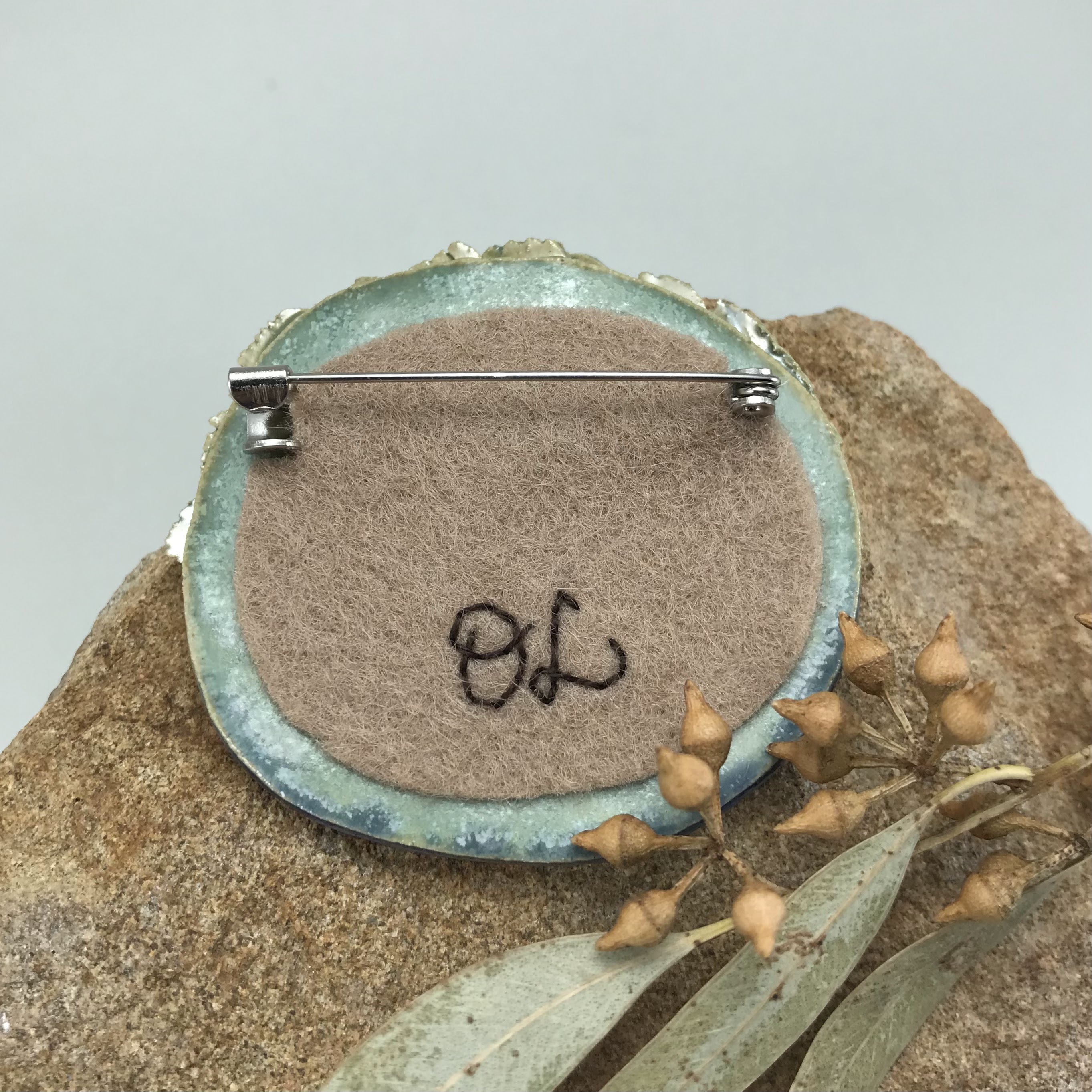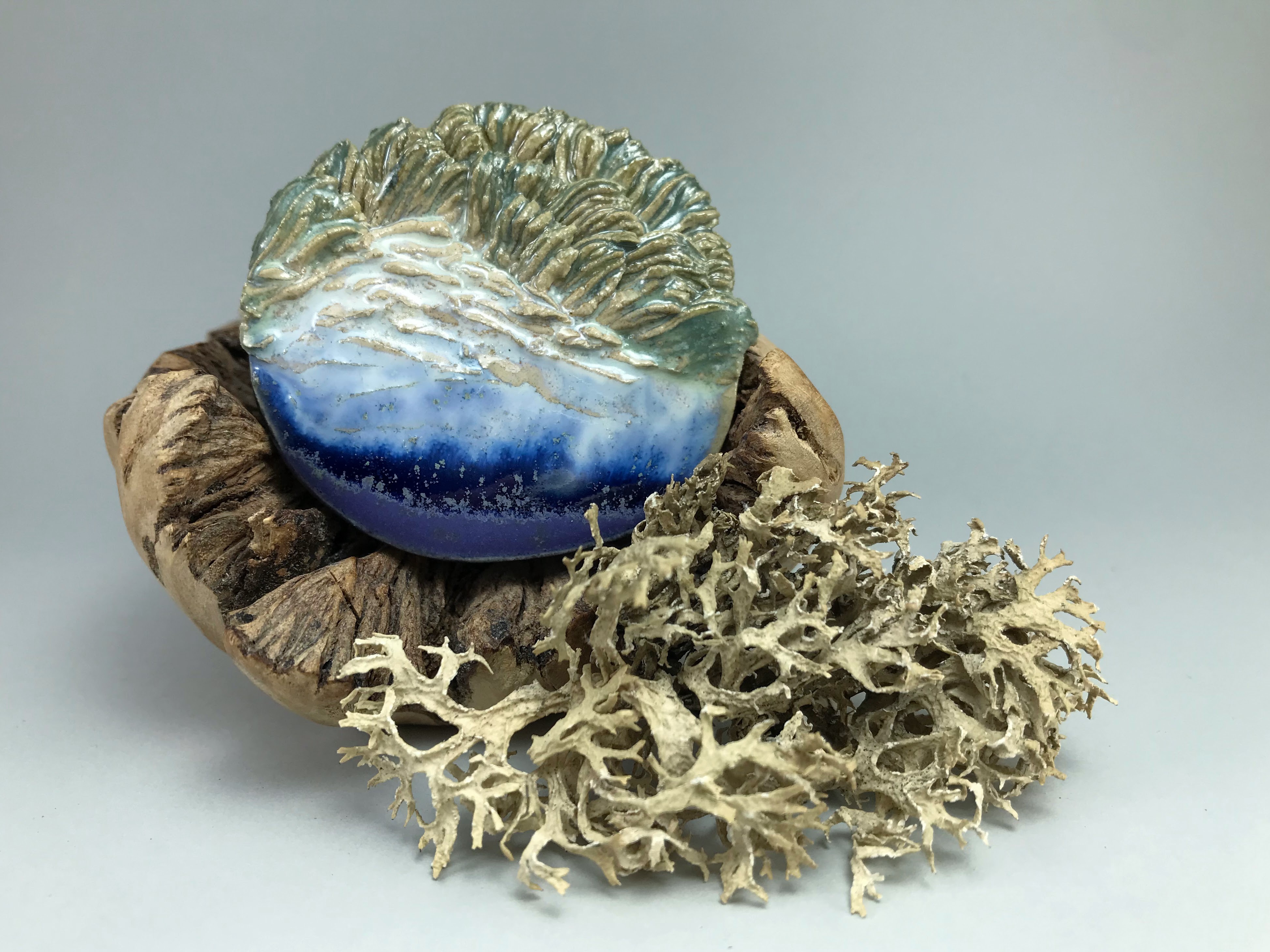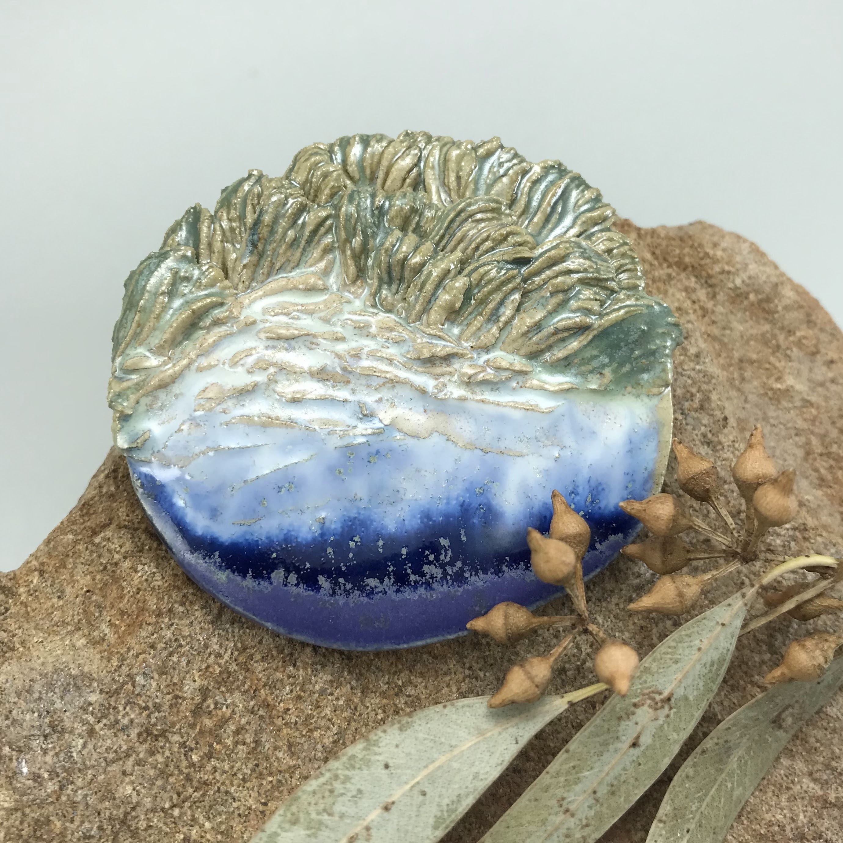The whisper of waves and the rustling of grass captured in a small piece of clay, or in simple words – ceramic landscape brooch, handmade. One-of-a-kind.