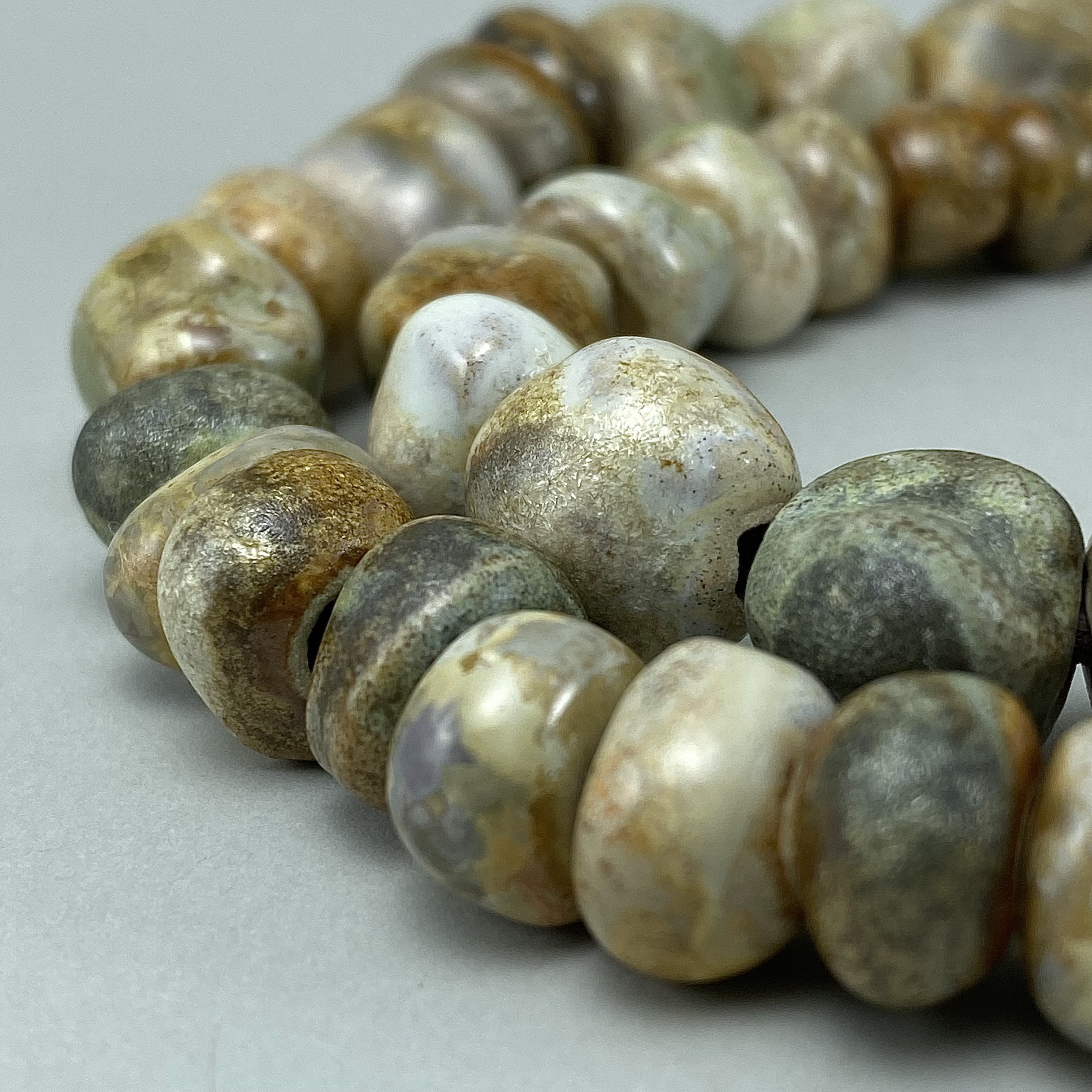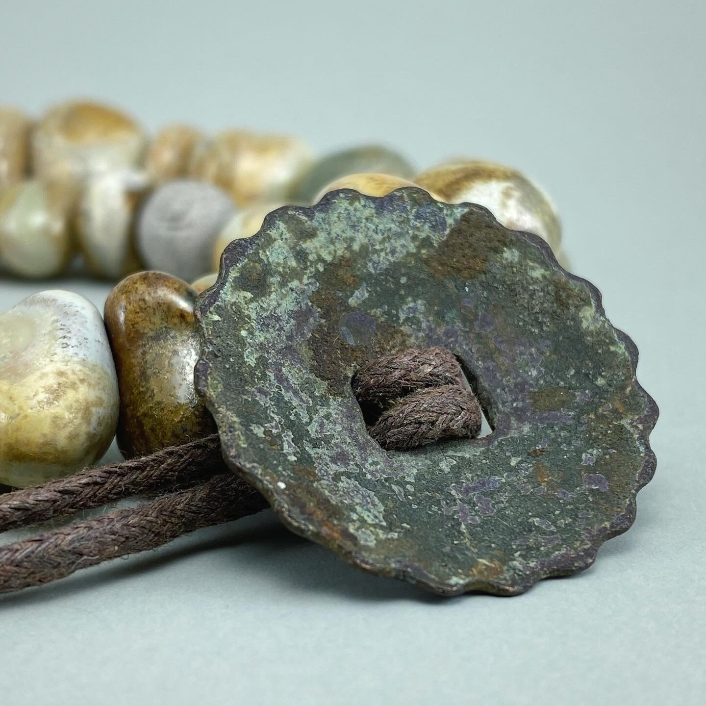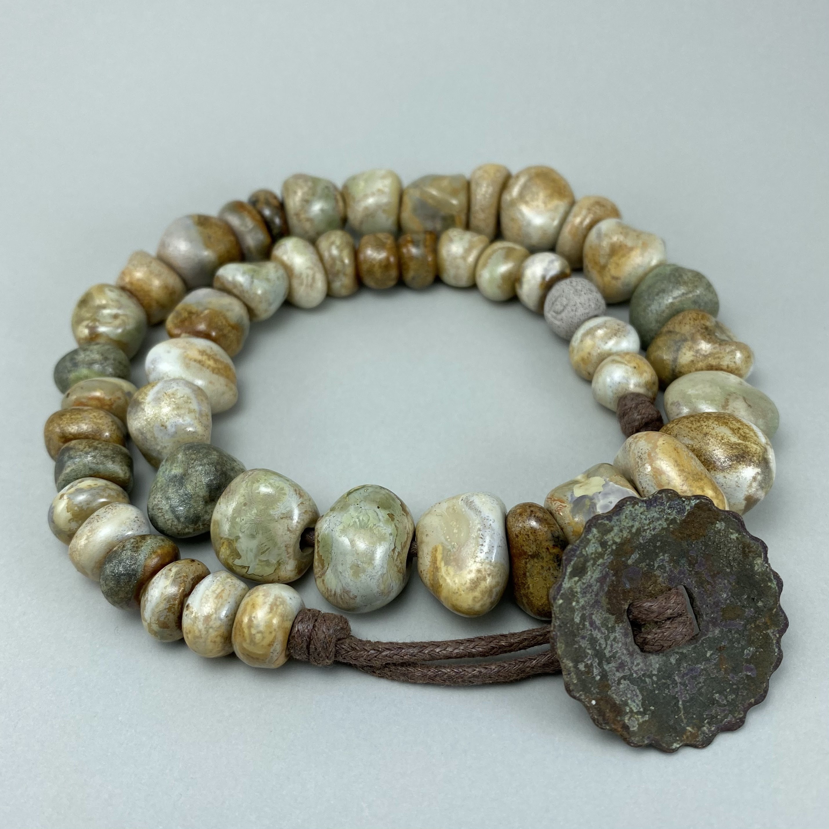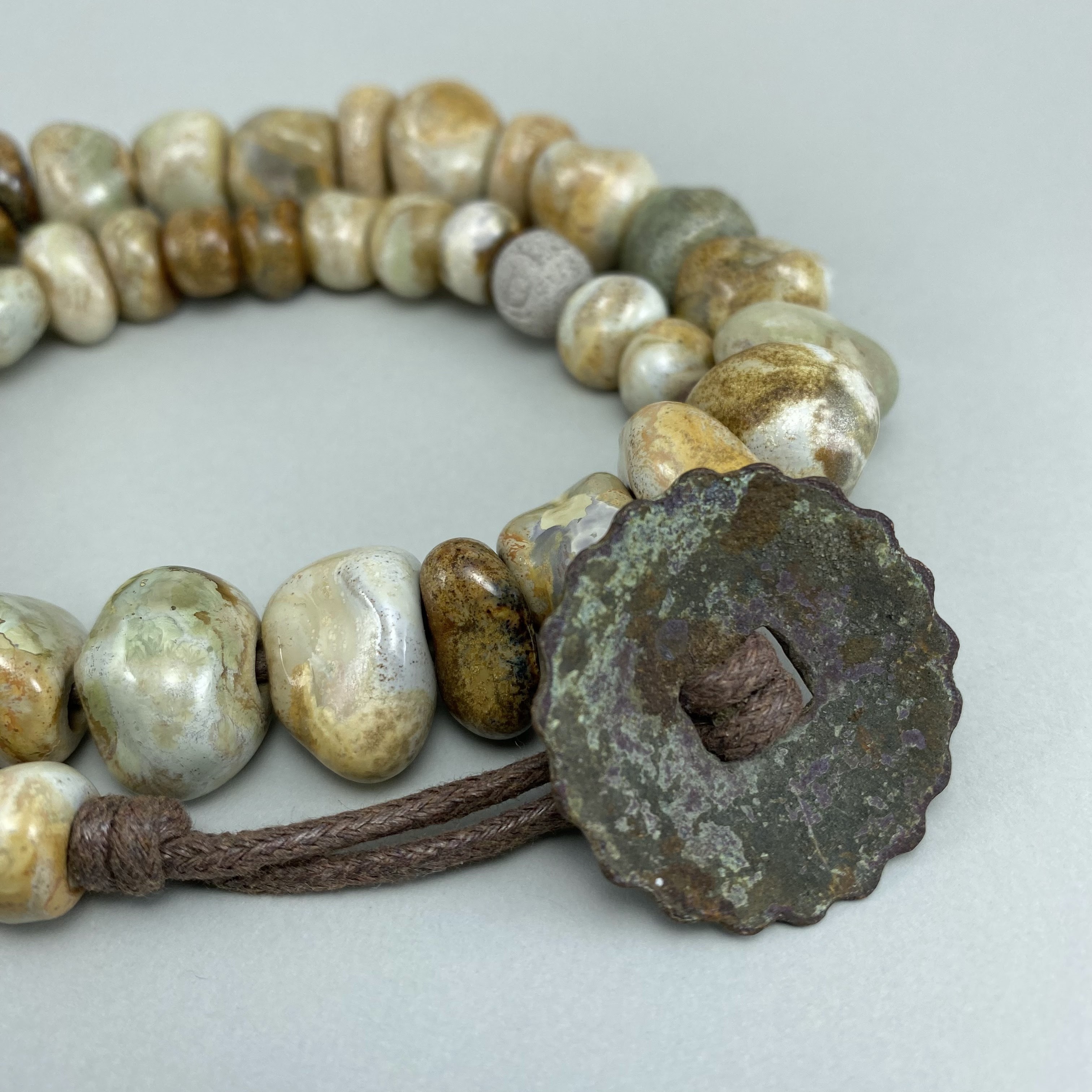 Clay can turn into anything – even beads reminiscent of ancient stones. When paired with an antique, time-tarnished metal button, with a magnificent, textured patina, it forms a necklace – weighty and vibrant, far separated from the spirit of the modernity.