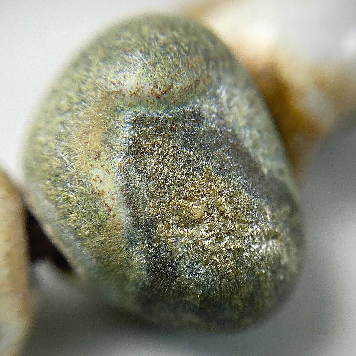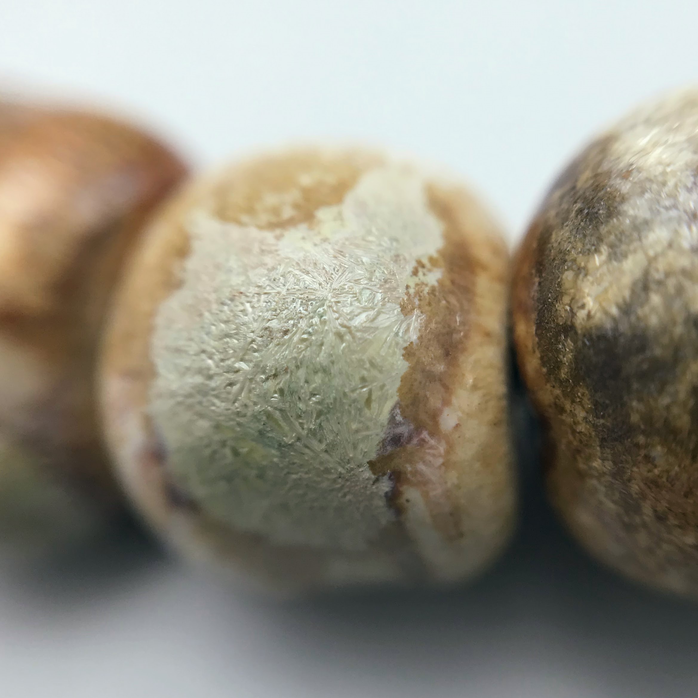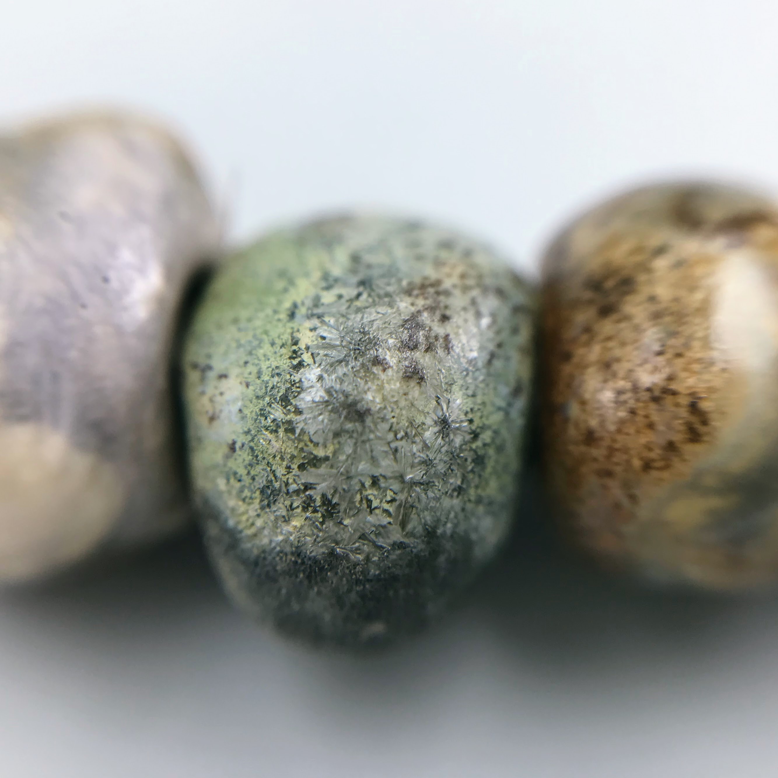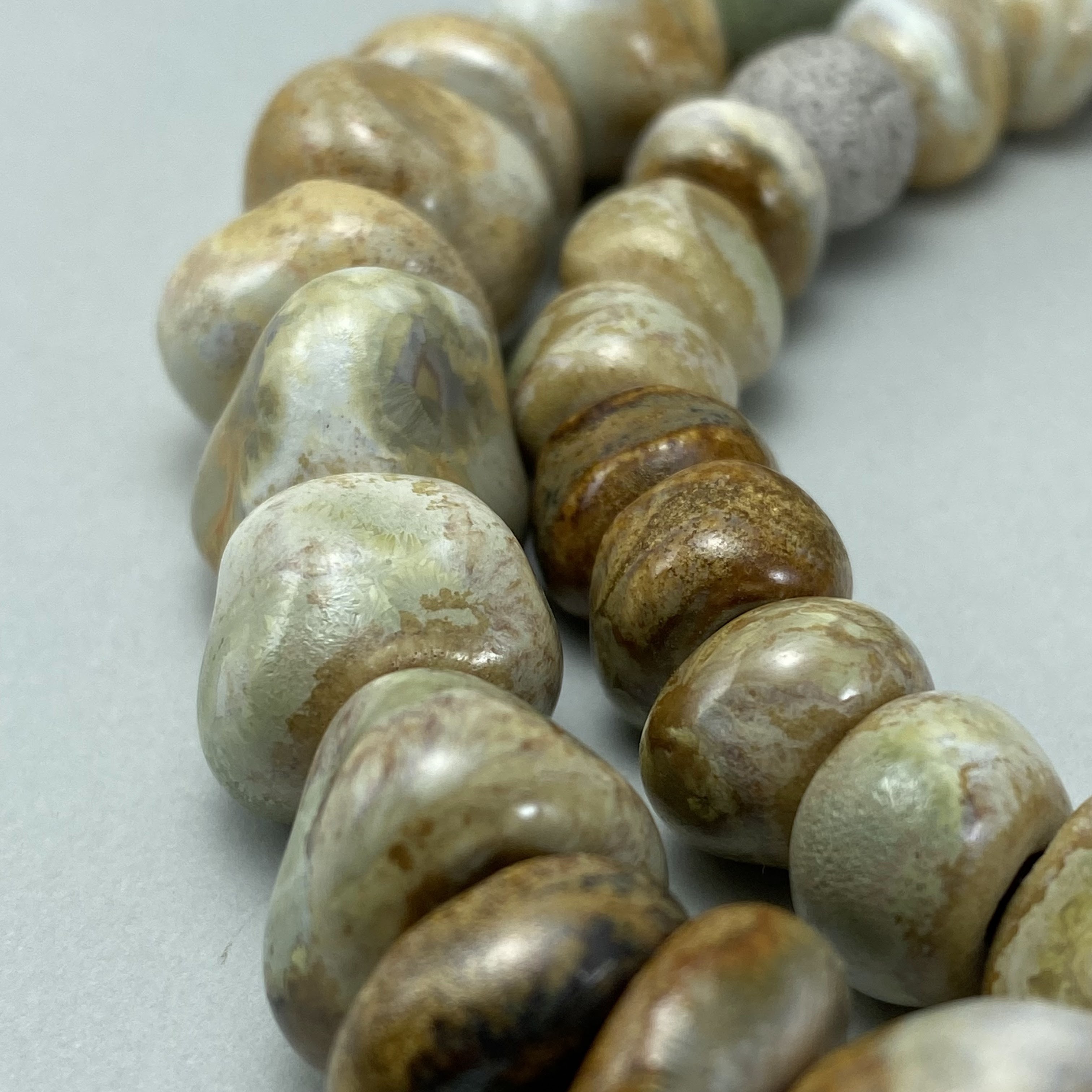 Clay can turn into anything – even beads reminiscent of ancient stones. When paired with an antique, time-tarnished metal button, with a magnificent, textured patina, it forms a necklace – weighty and vibrant, far separated from the spirit of the modernity.