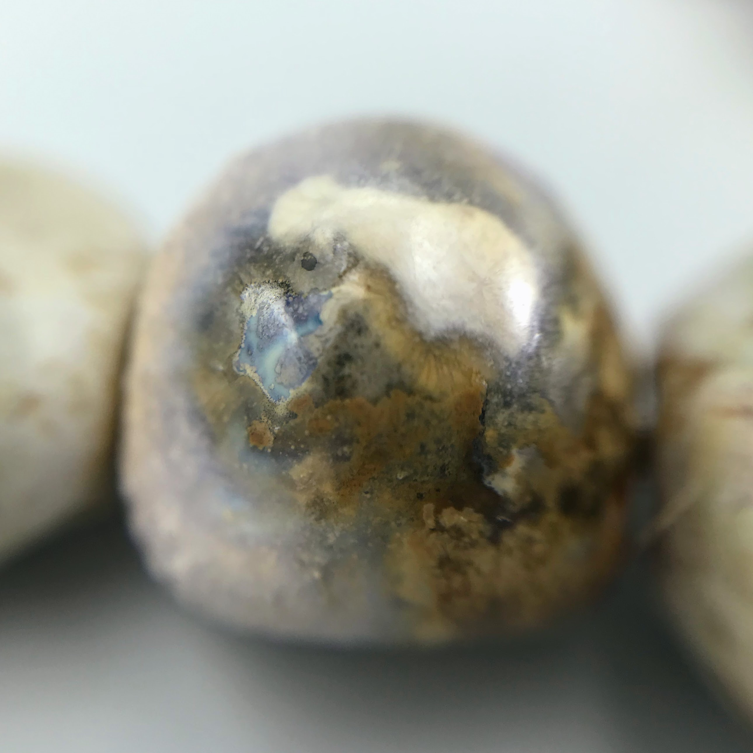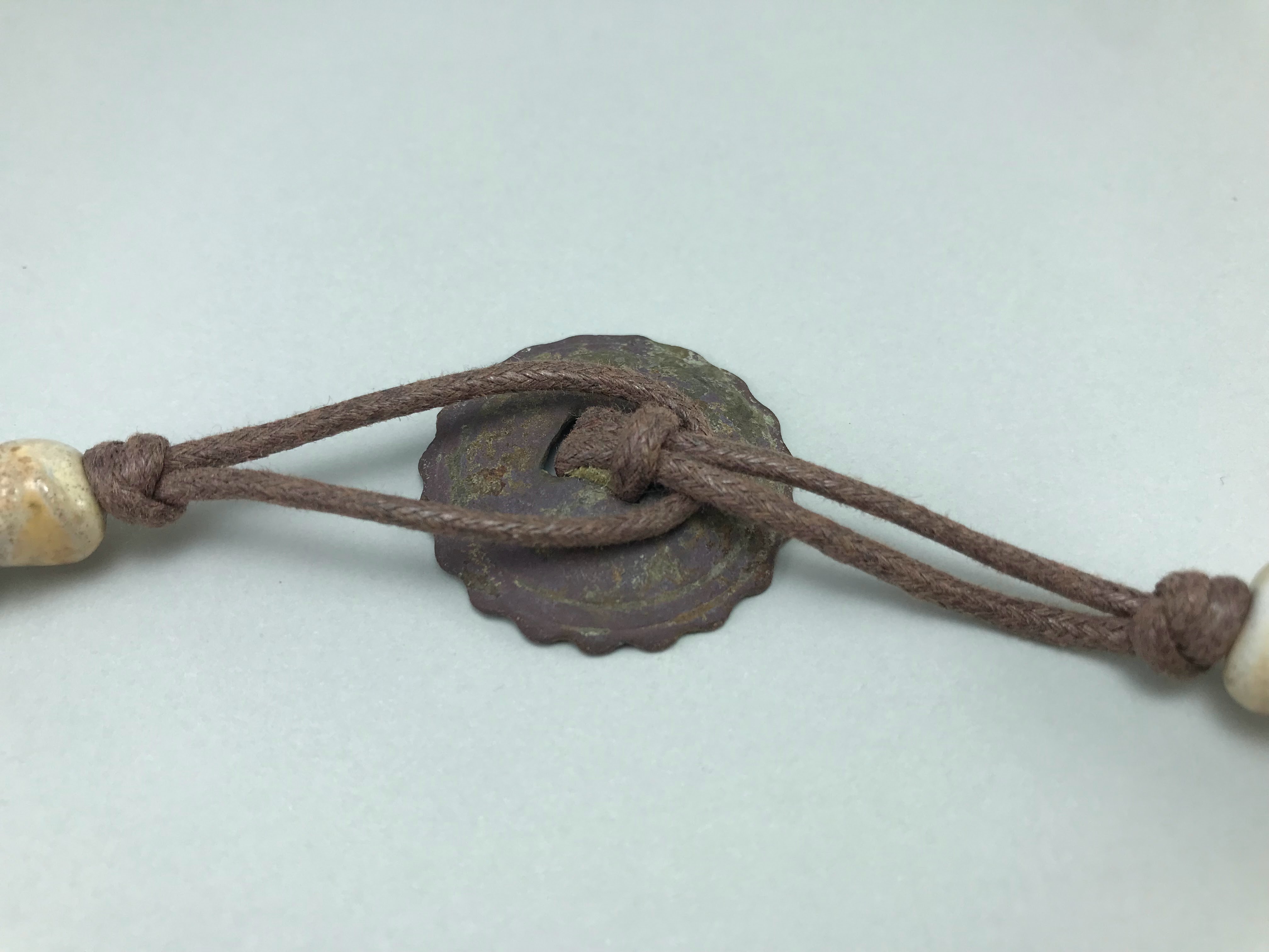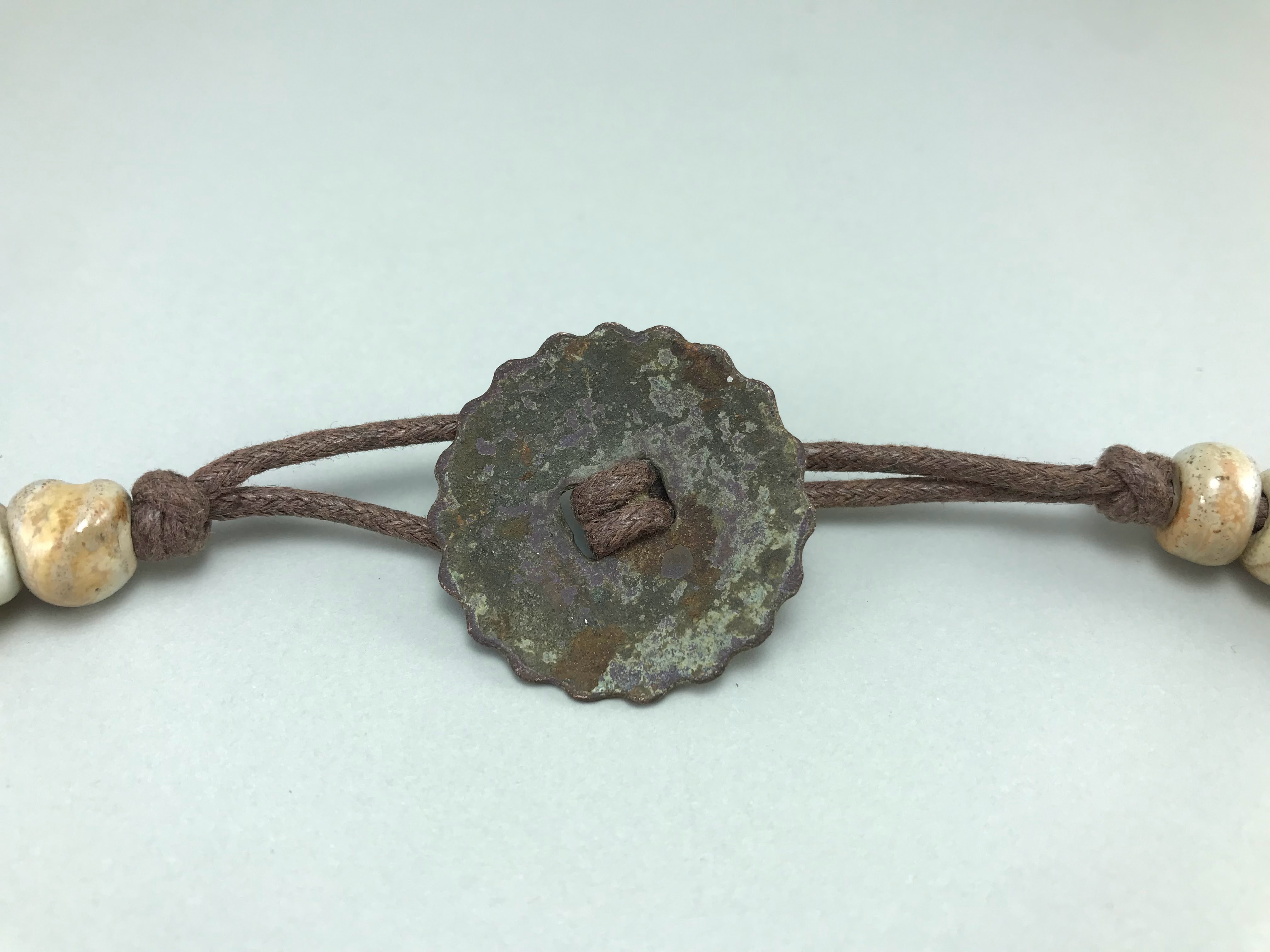 Materials: Sibelco clay, Welte glazes, cotton cord, antique metal button.