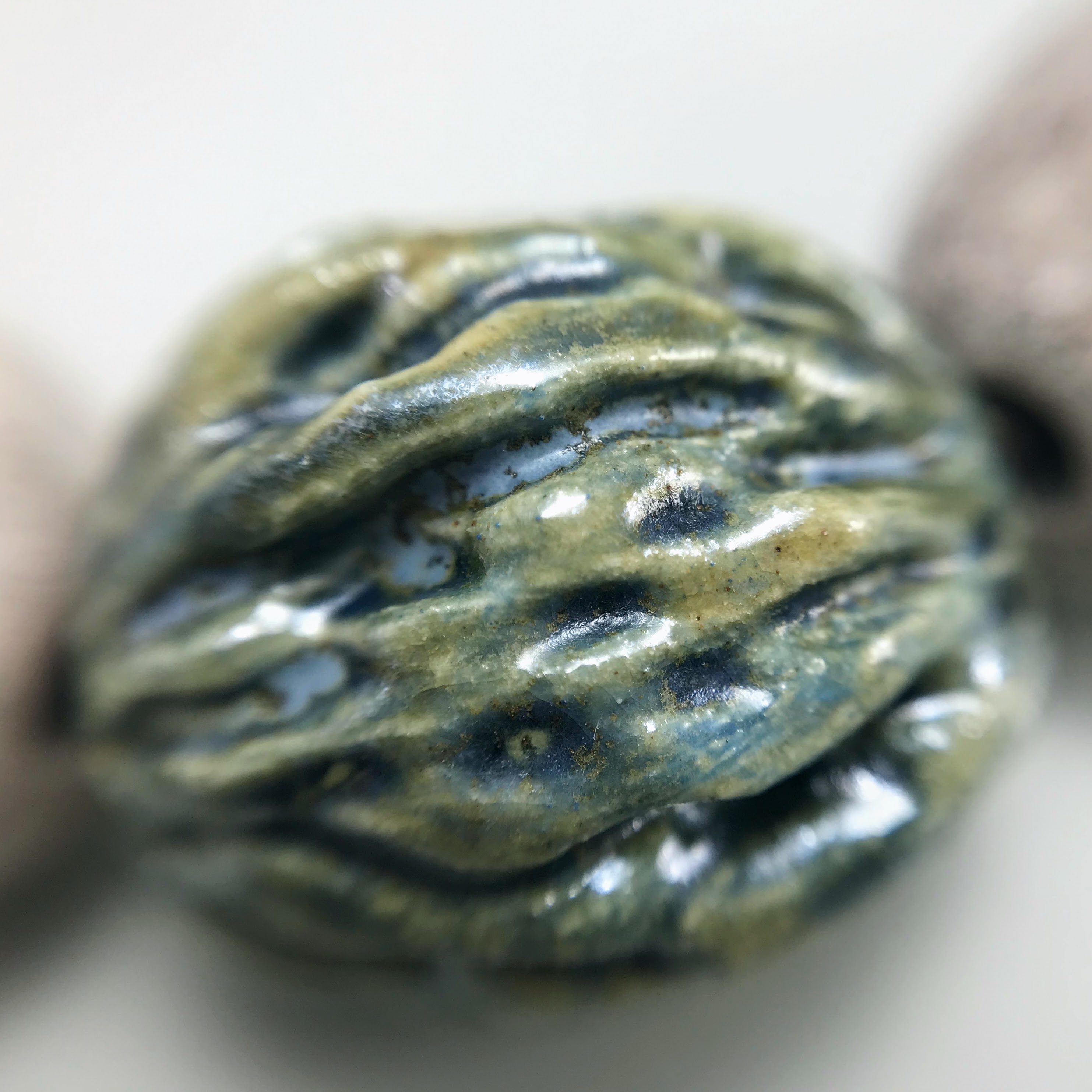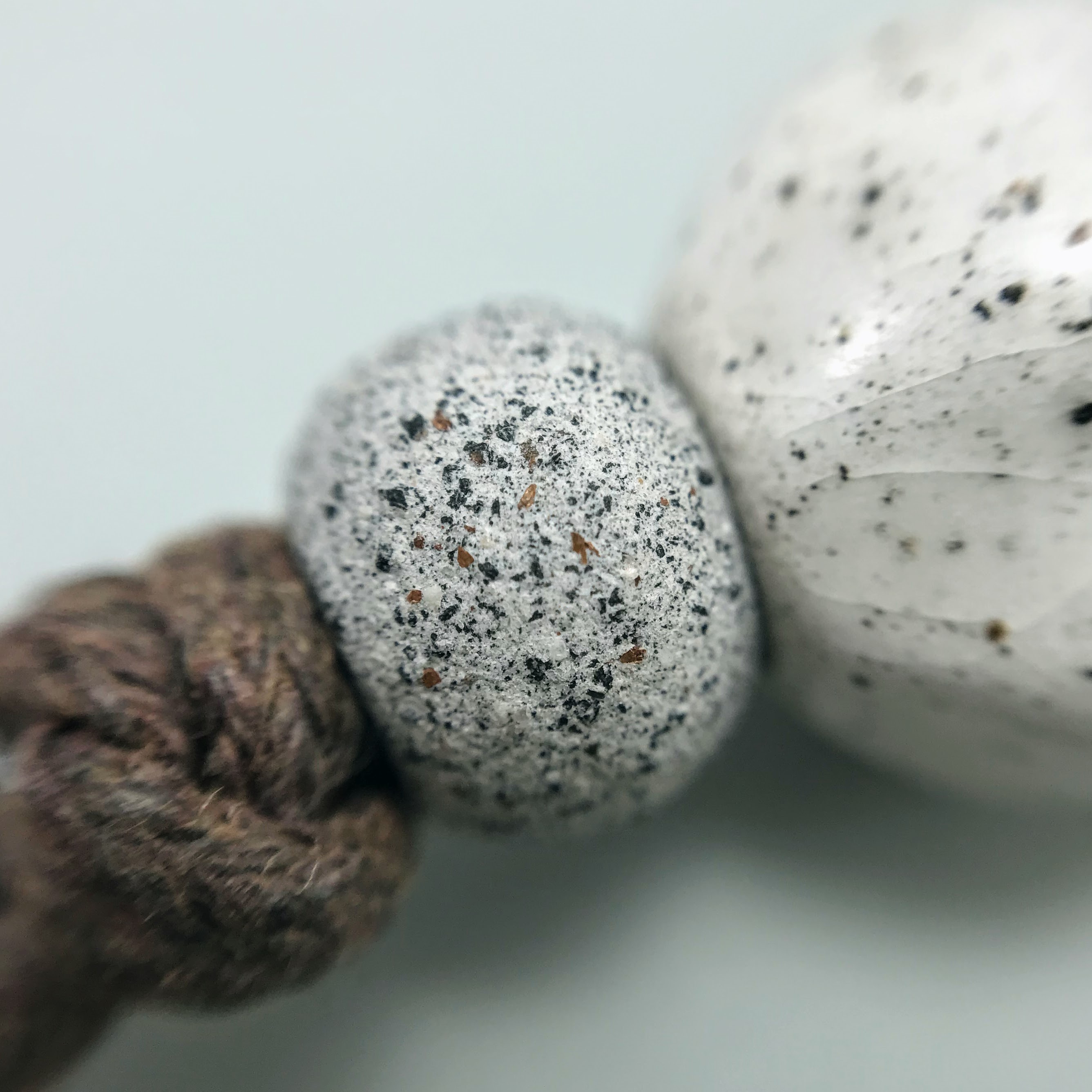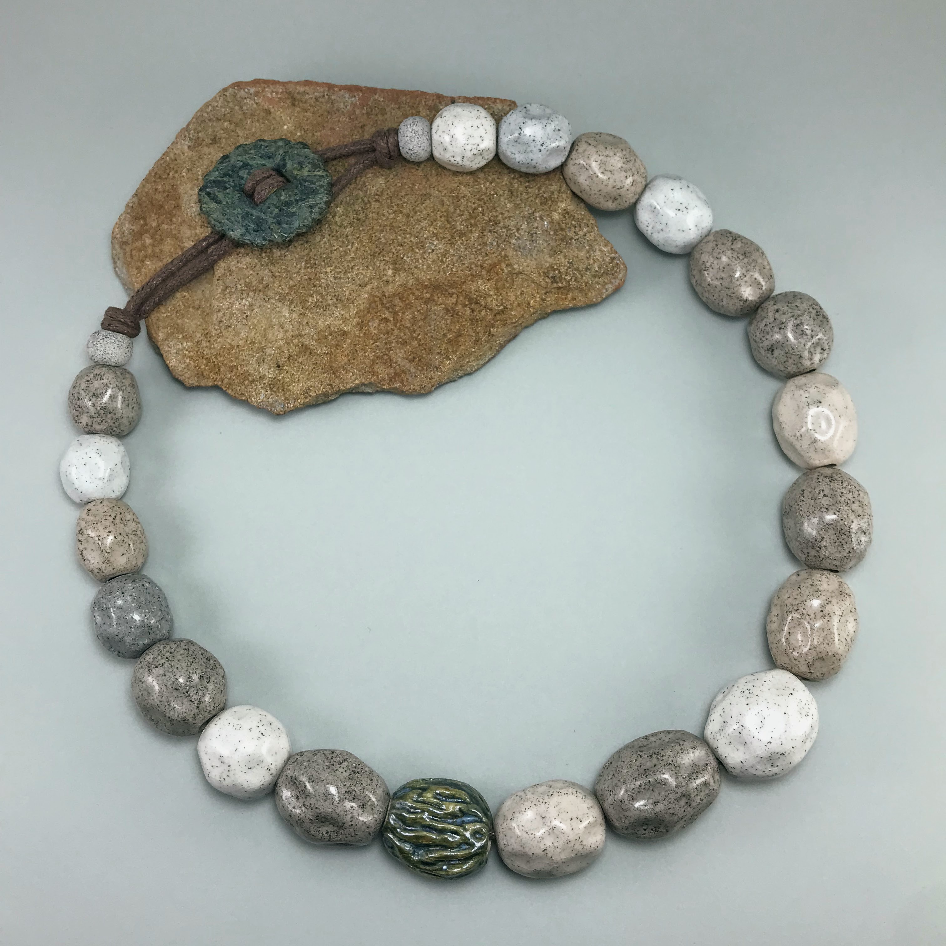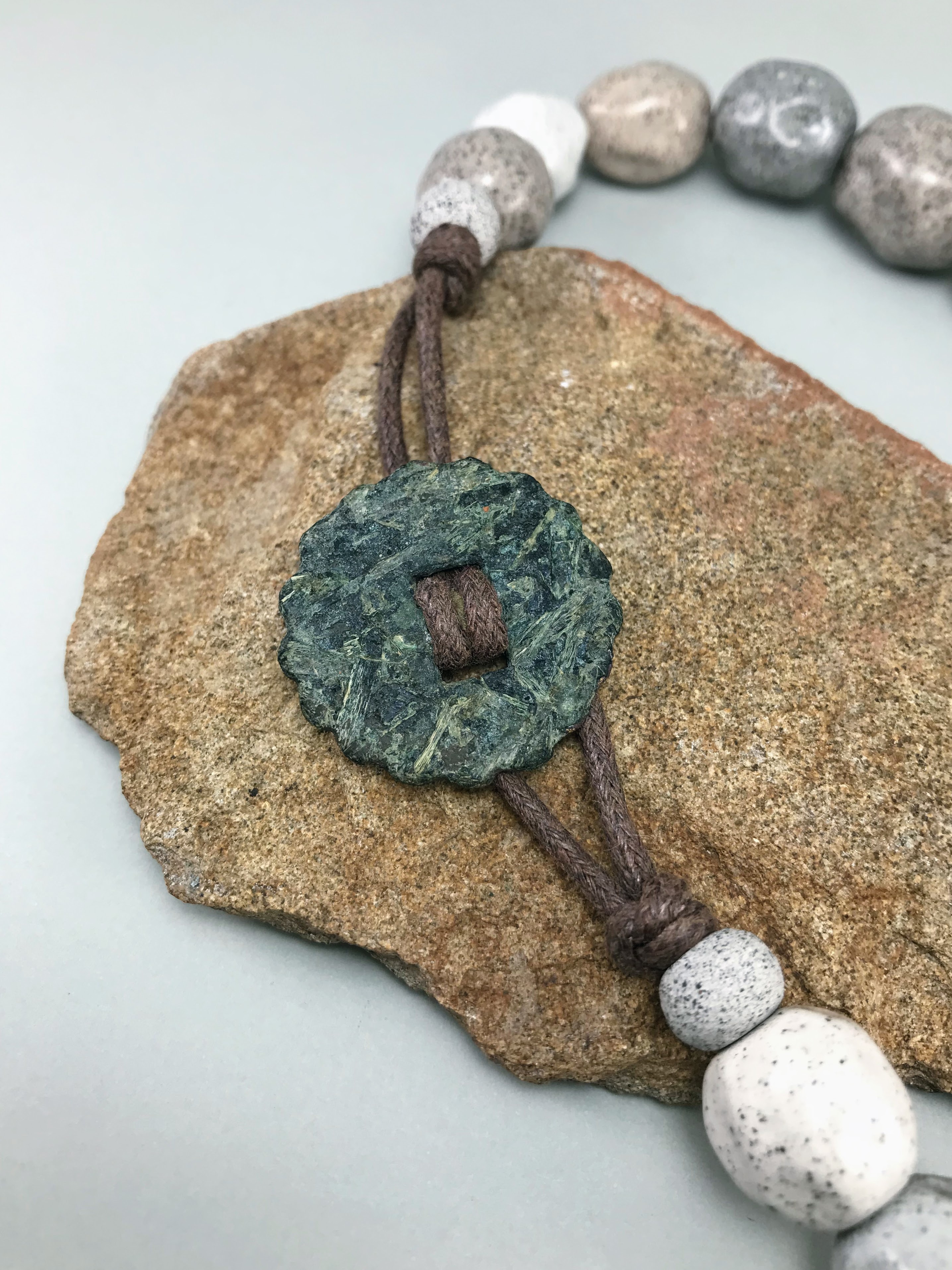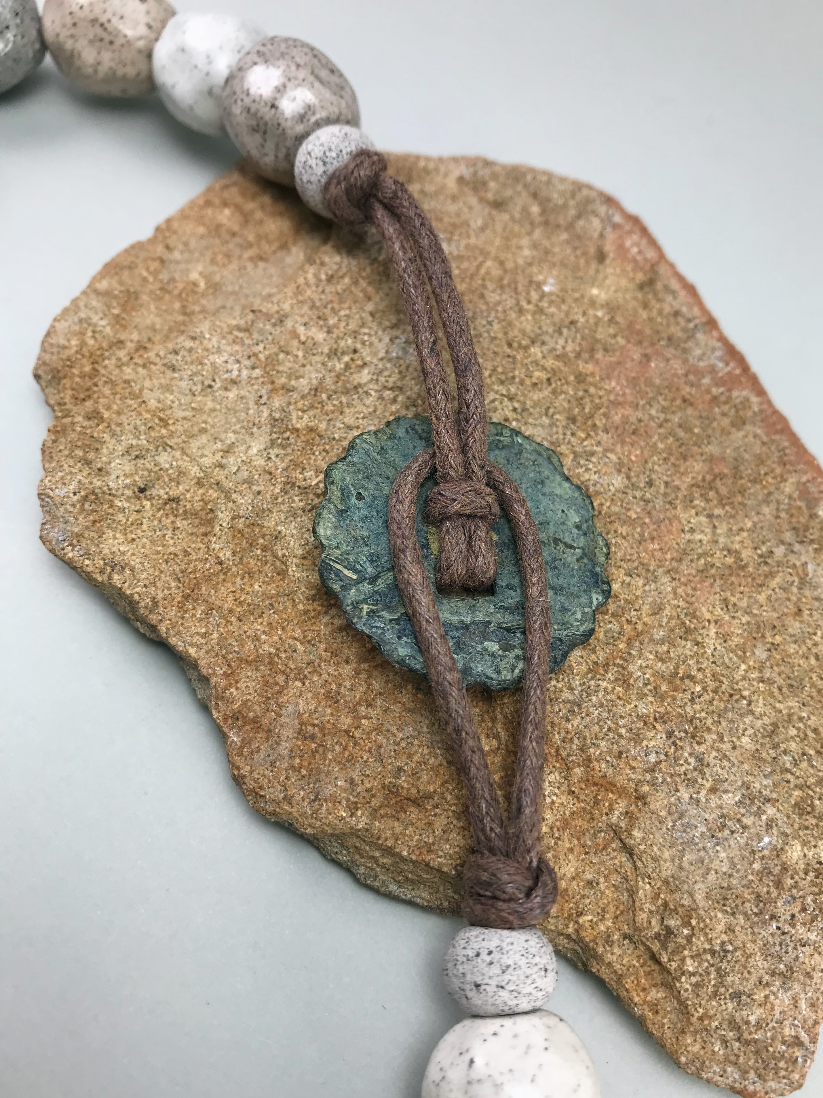 Materials: Sibelco clay, Botz and Welte glazes, cotton cord, antique metal button.