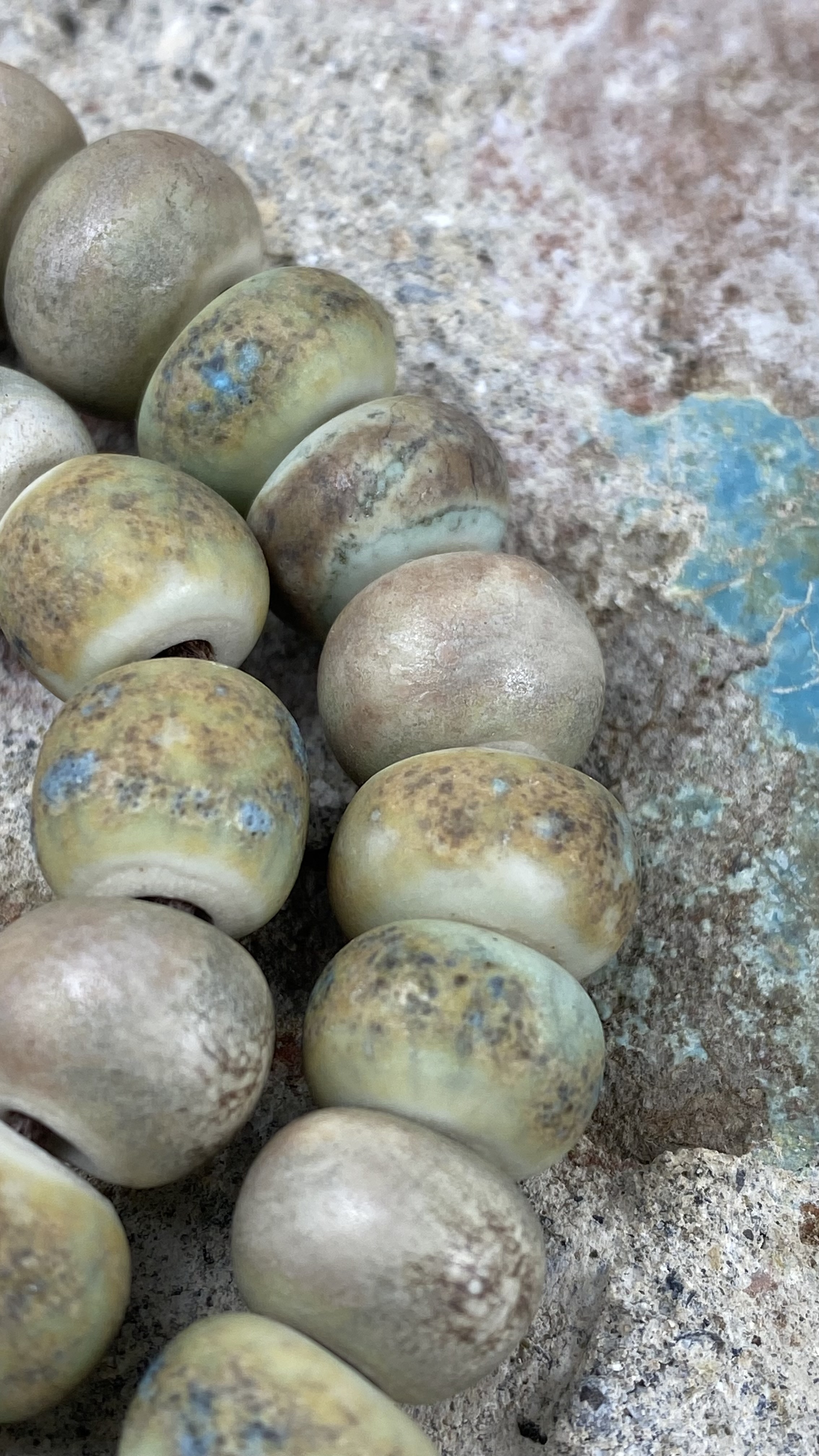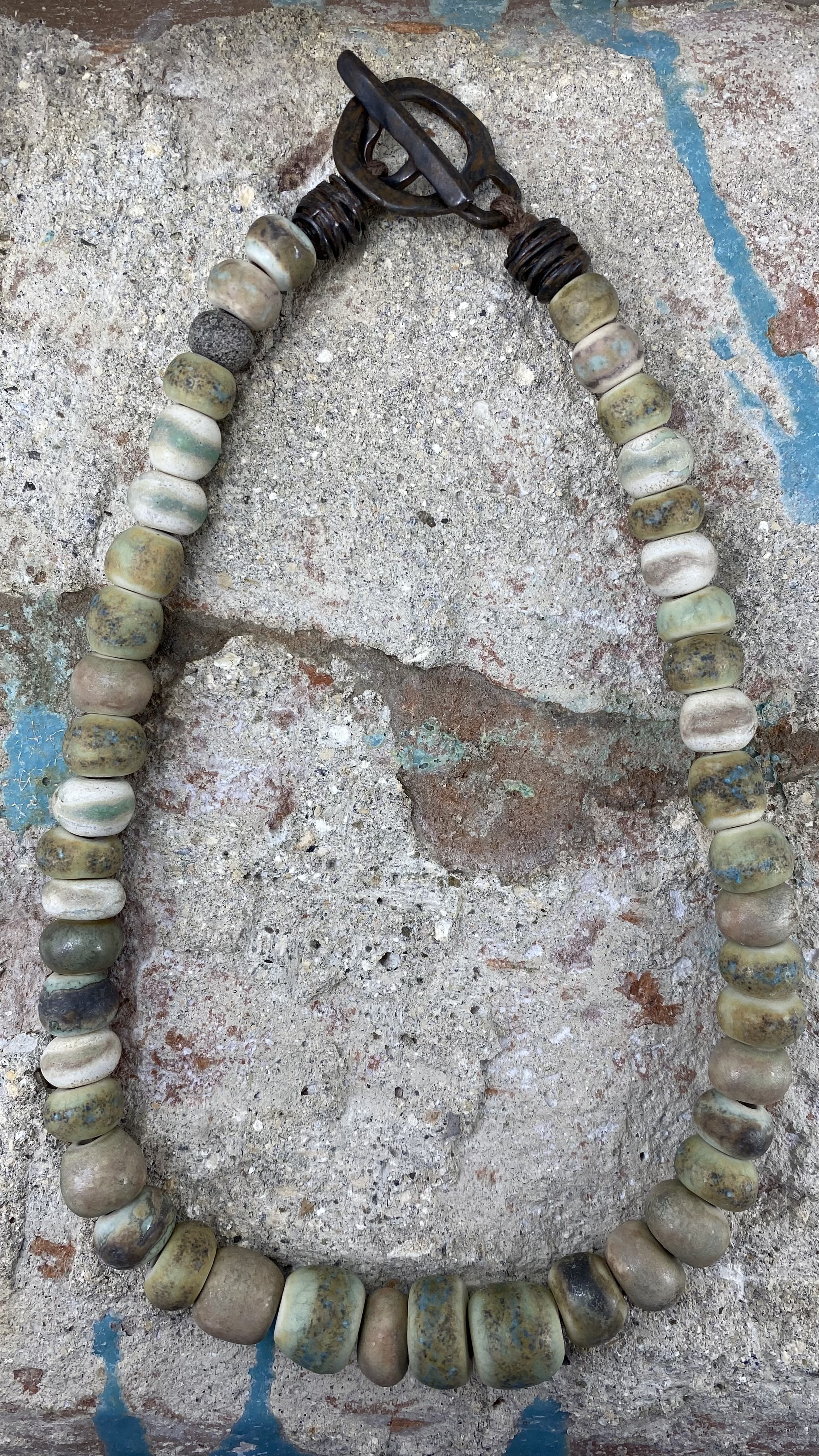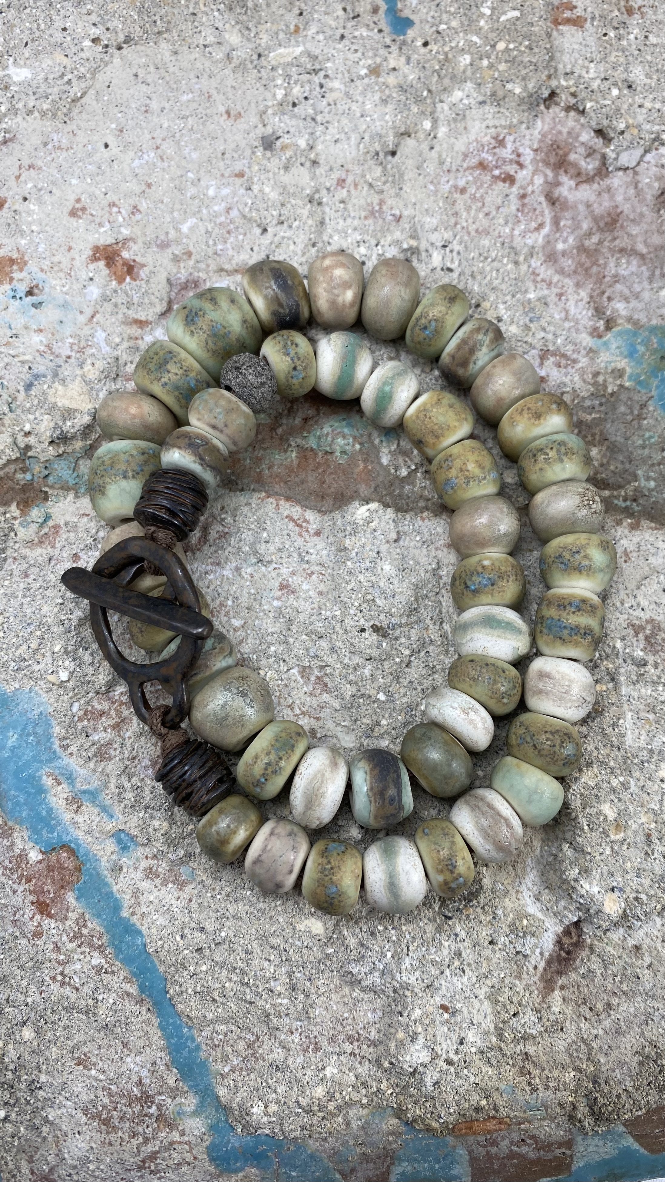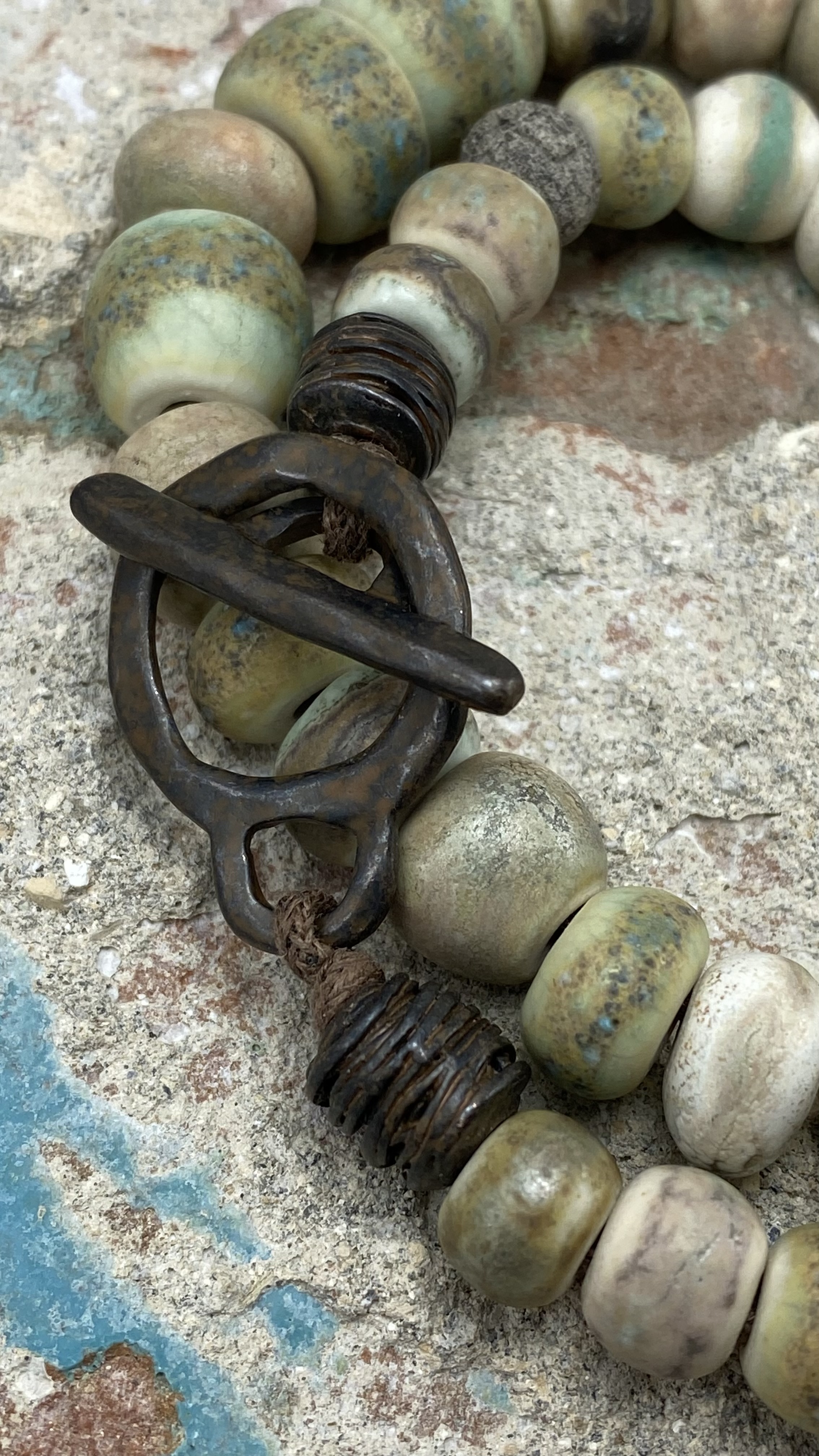 Materials: Sibelco clay, Welte glazes, AGM glazes, cotton cord, two handmade pewter beads and a toggle clasp.