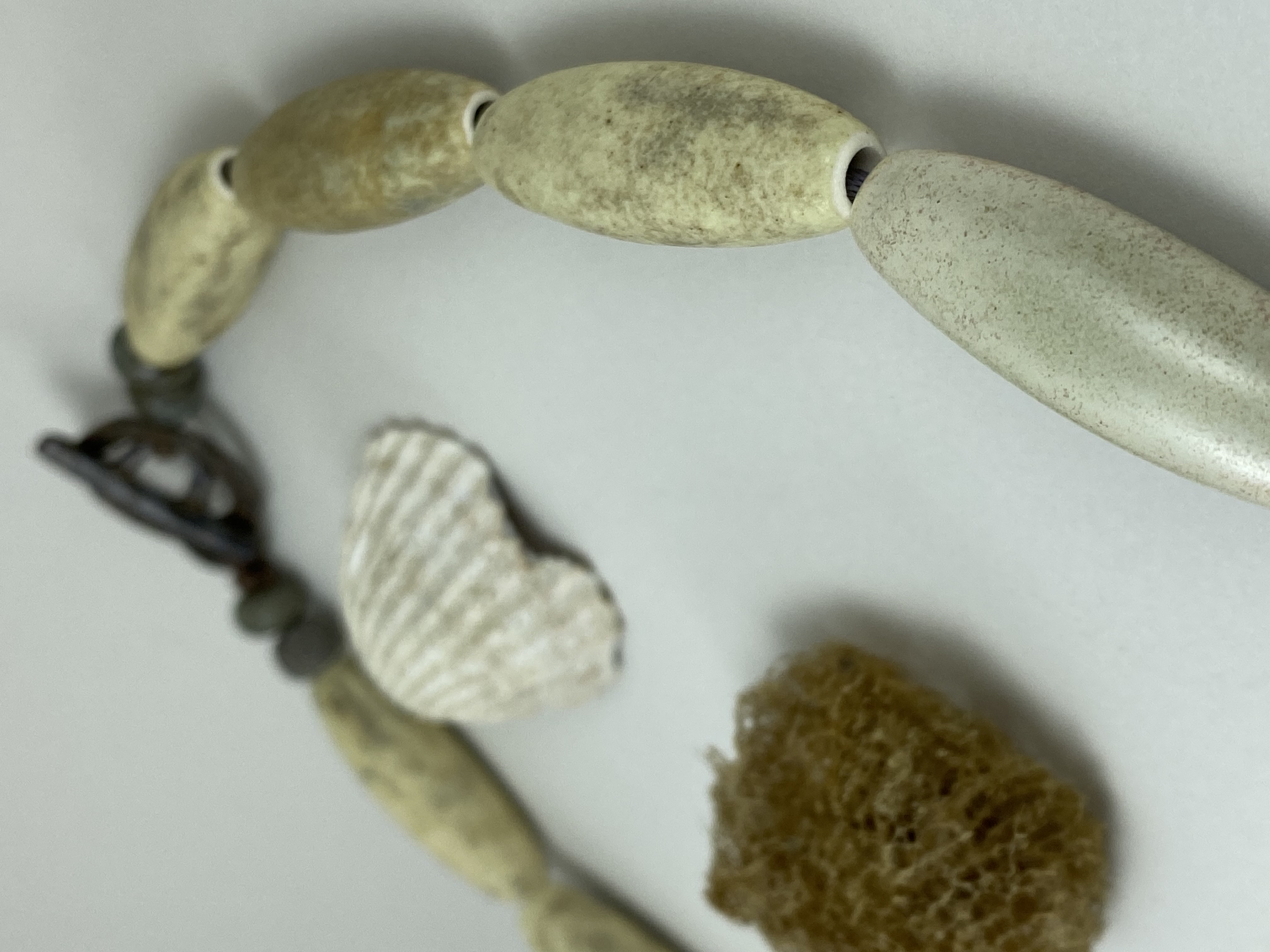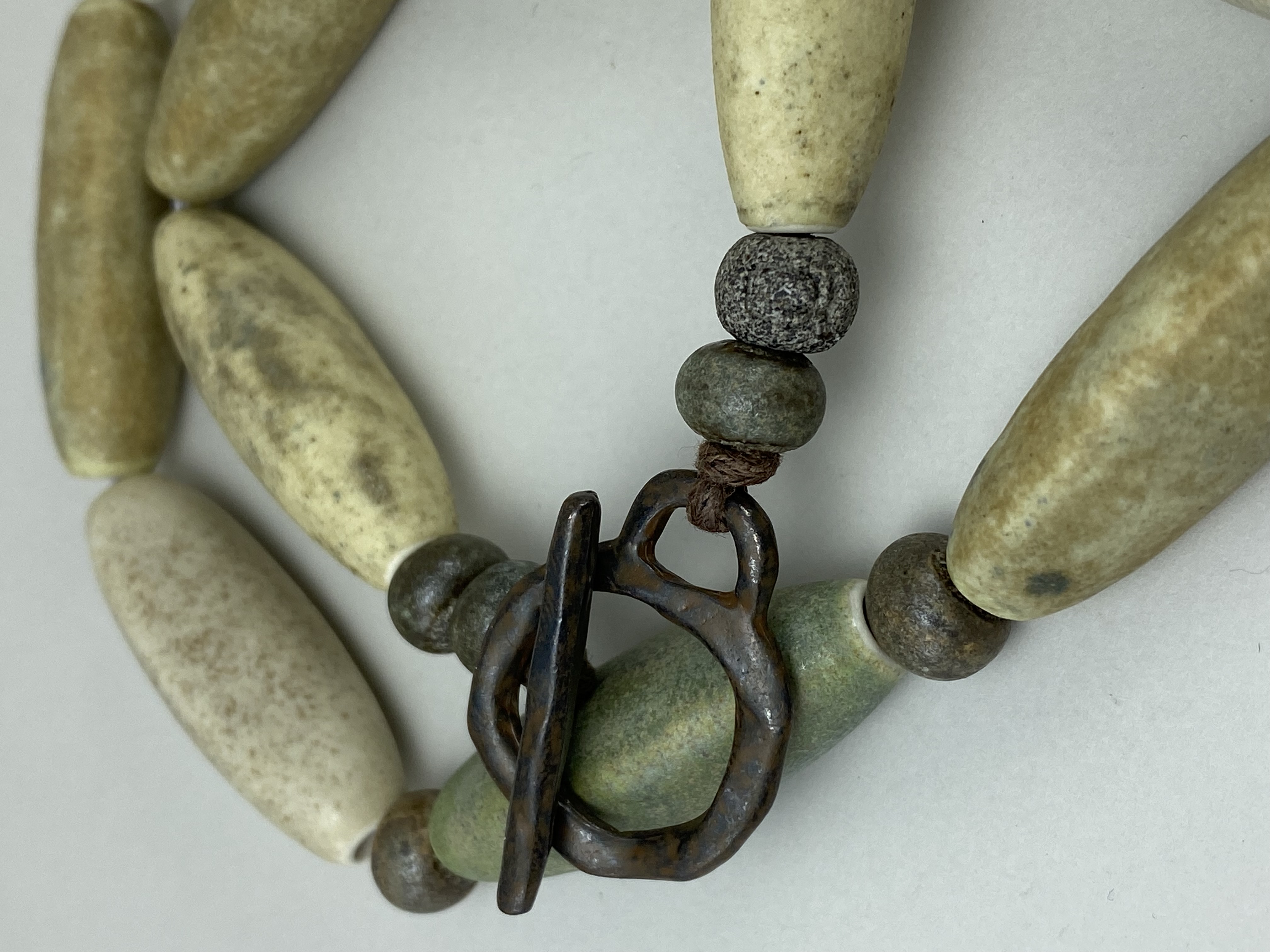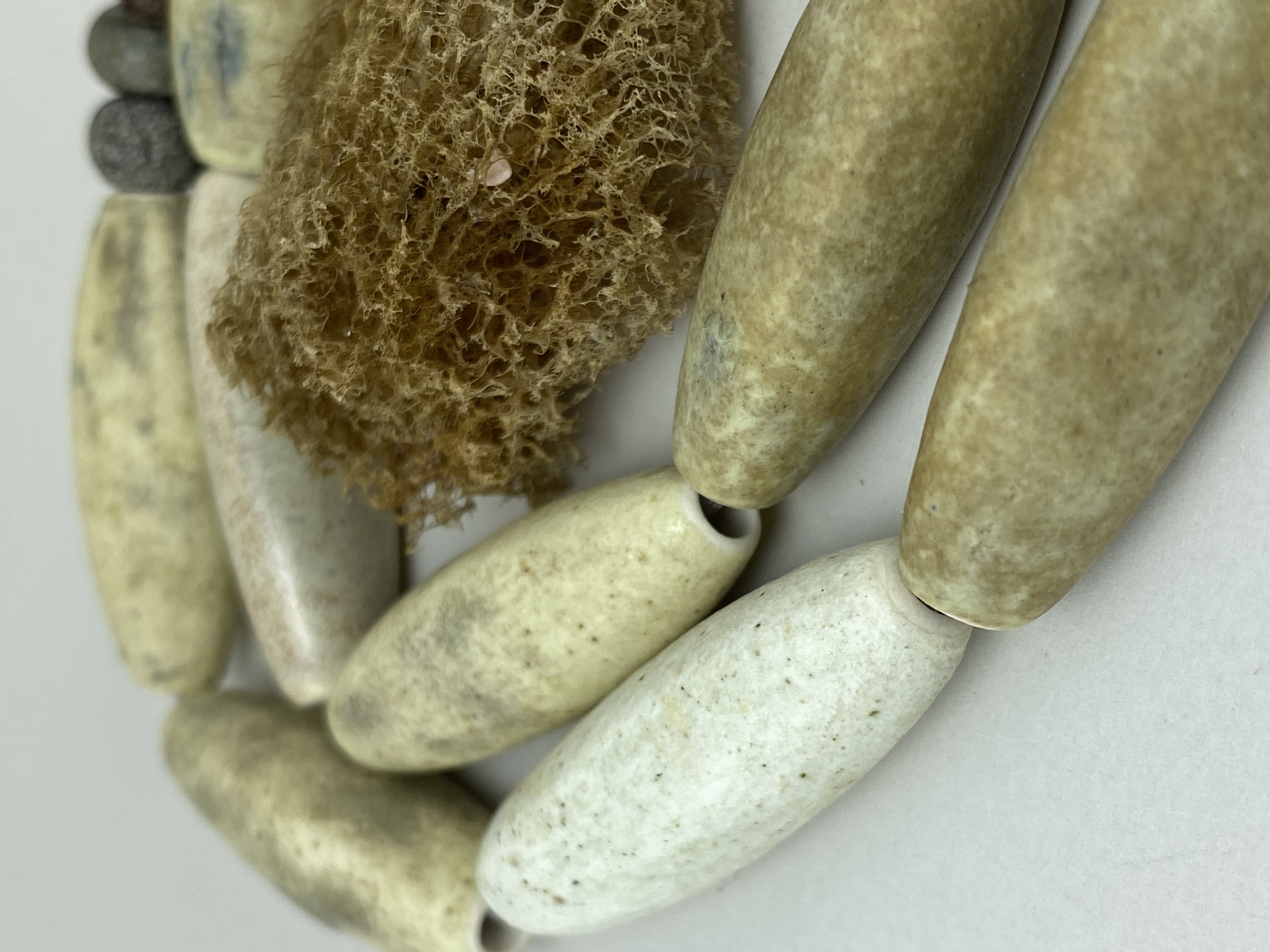 Materials: Sibelco clay, Welte glazes, AGM glazes, cotton cord, handmade pewter toggle clasp.