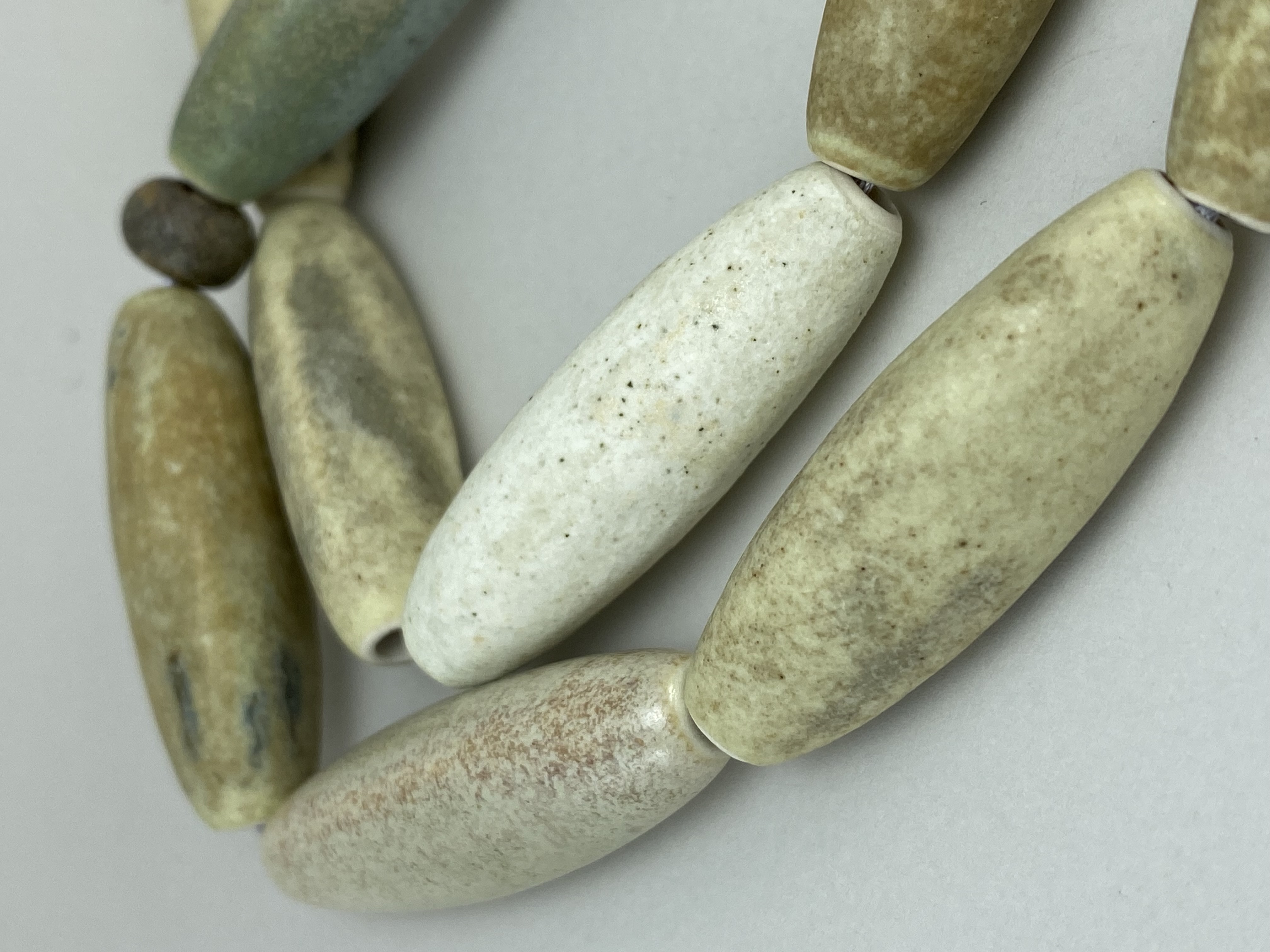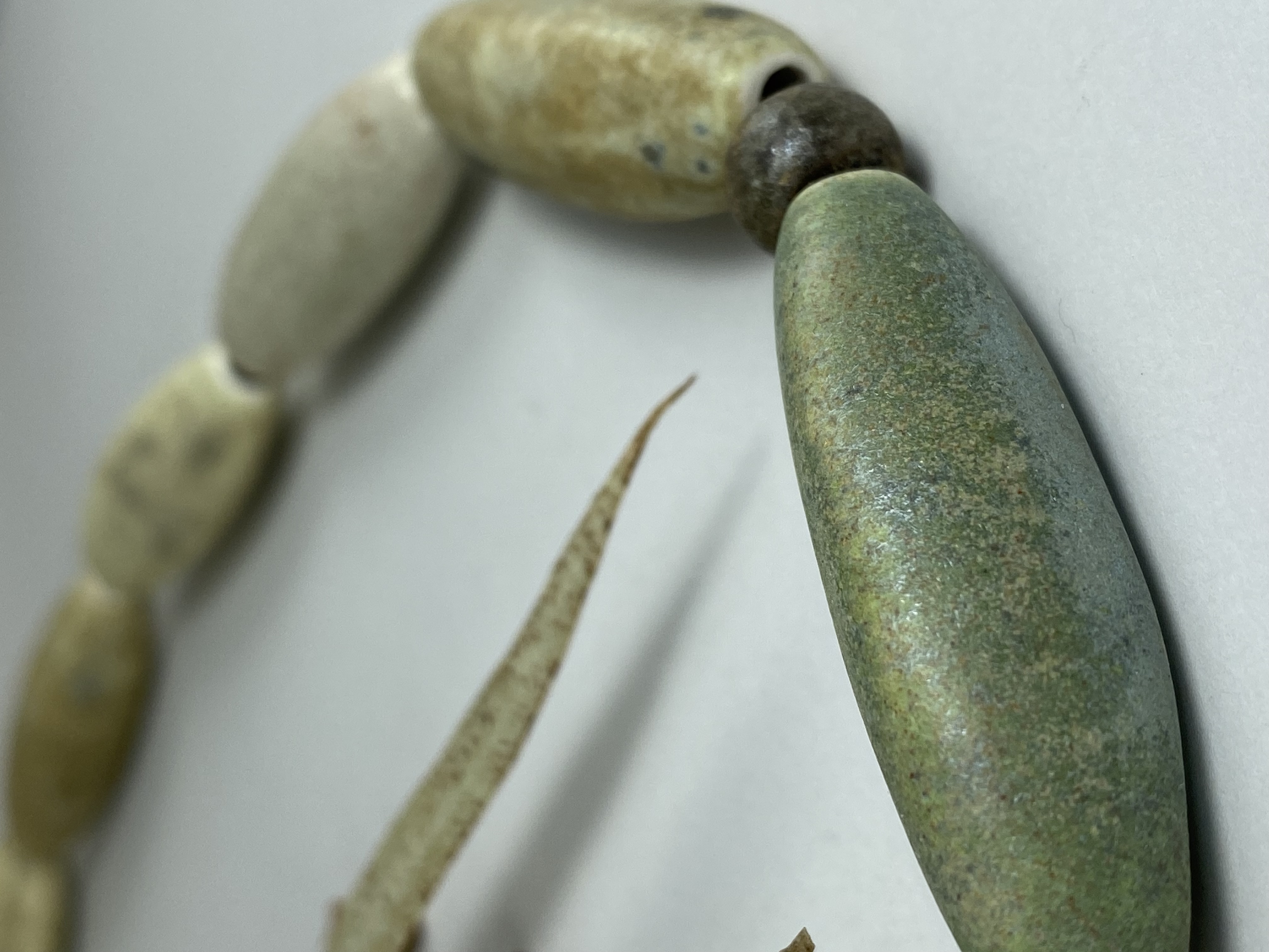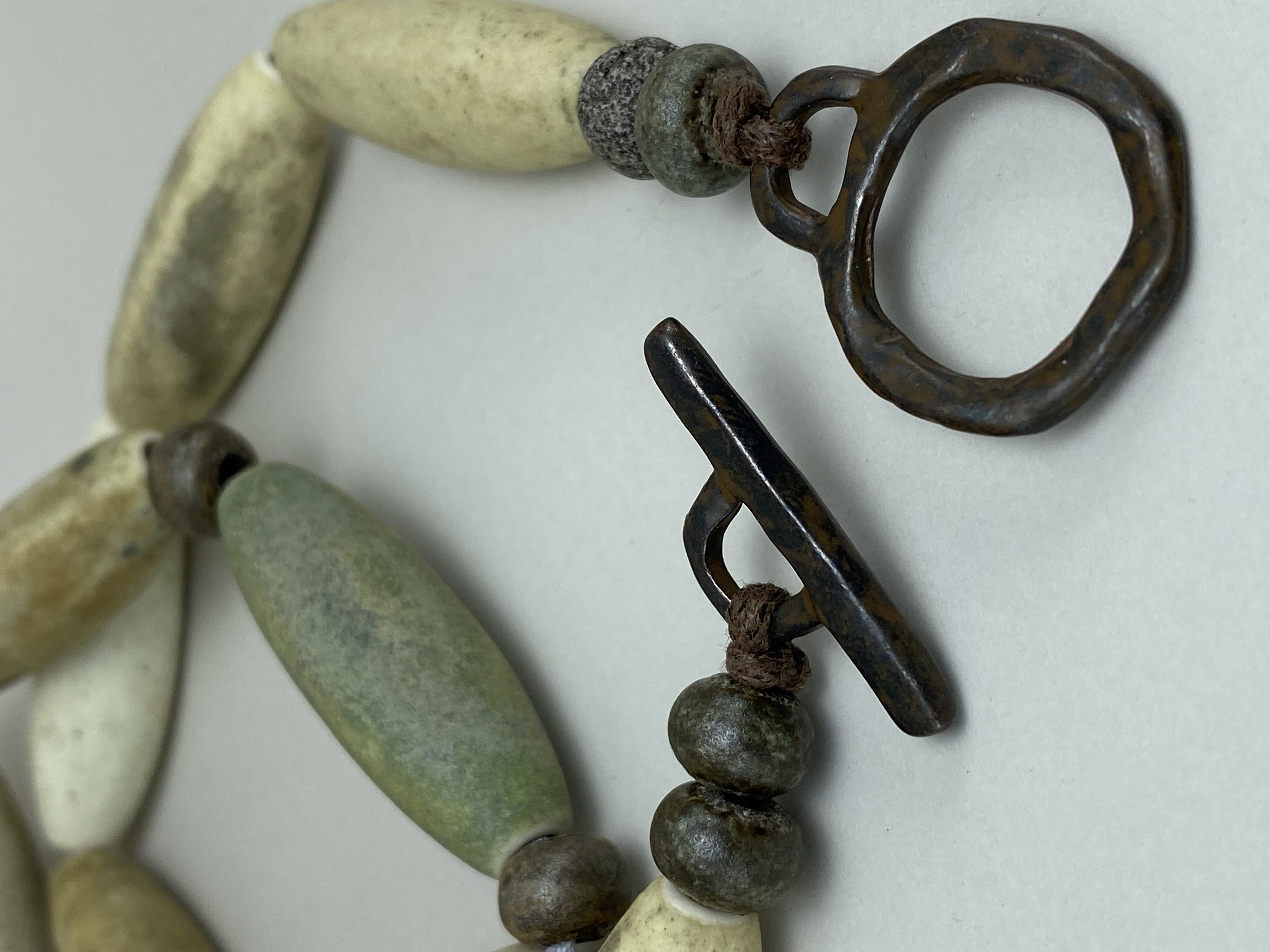 Materials: Sibelco clay, Welte glazes, AGM glazes, cotton cord, handmade pewter toggle clasp.
