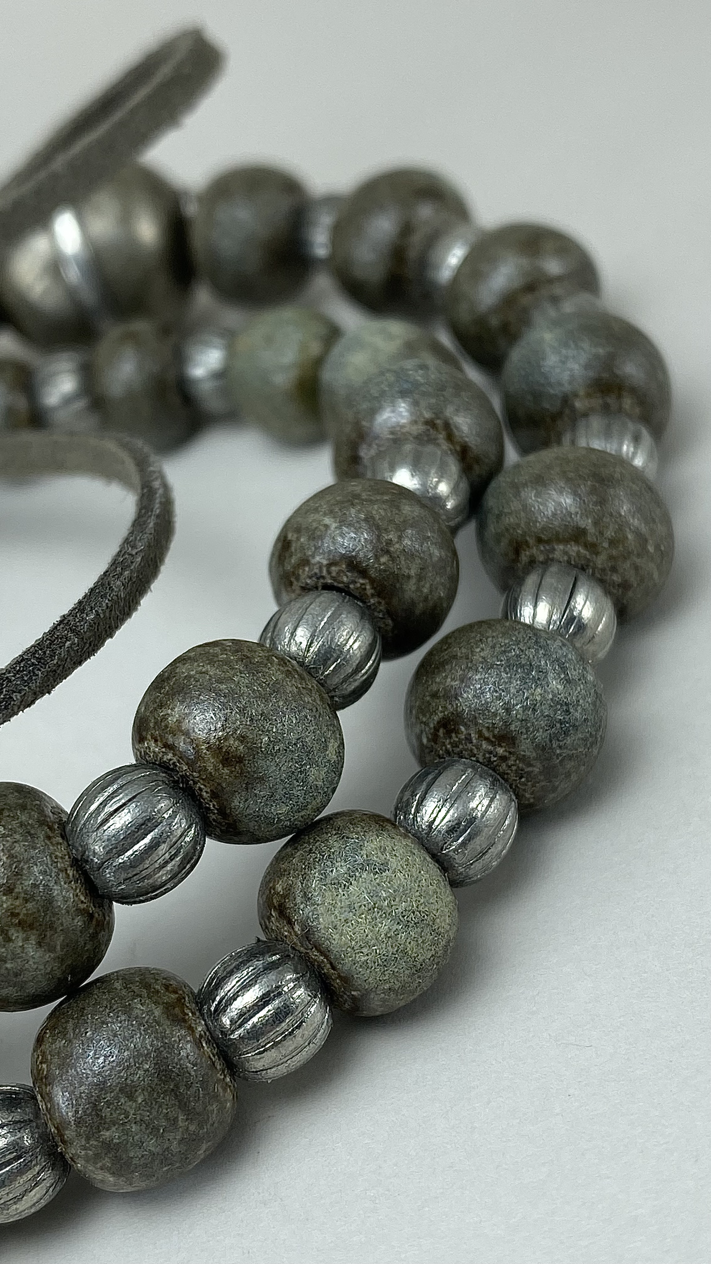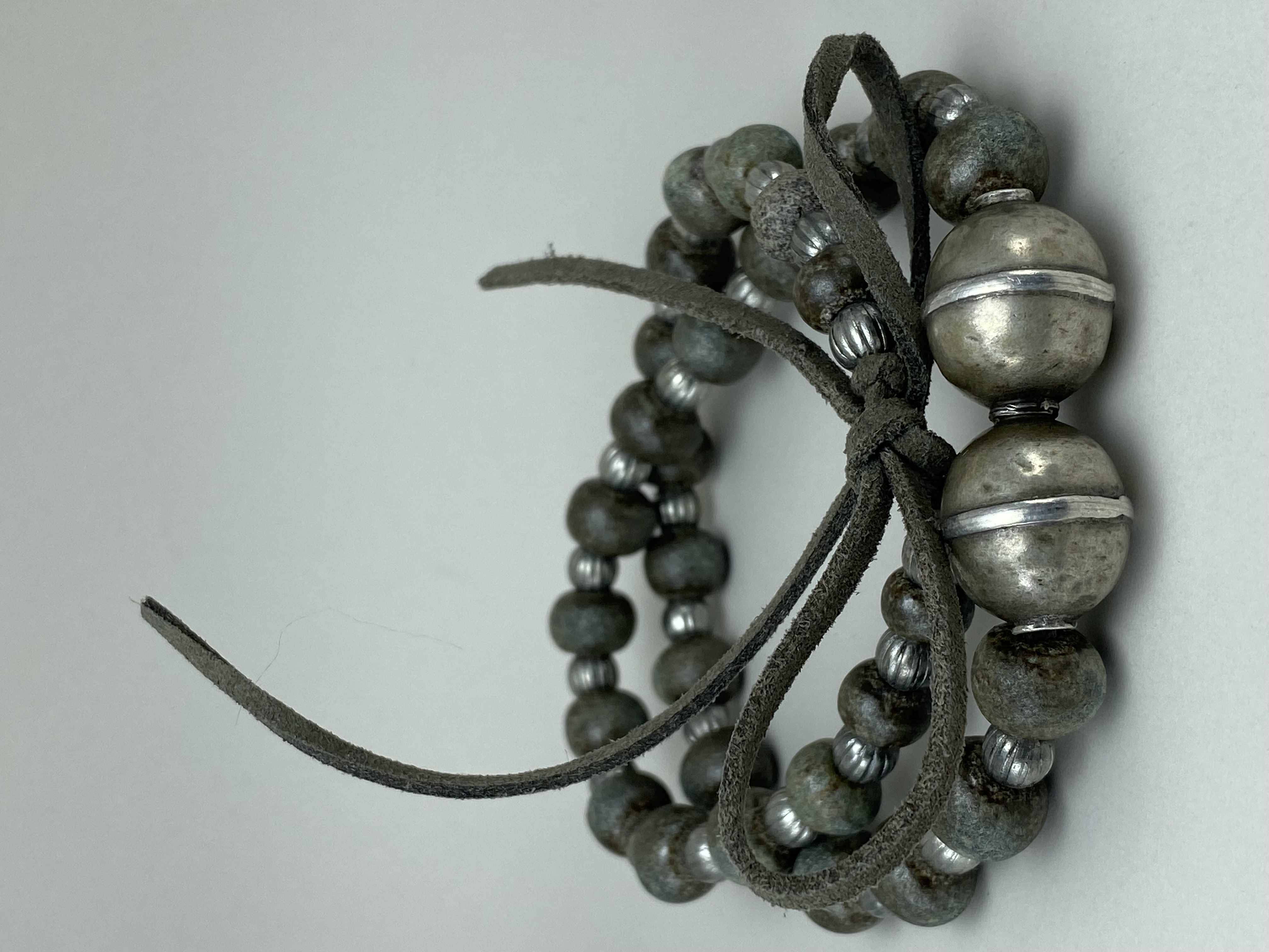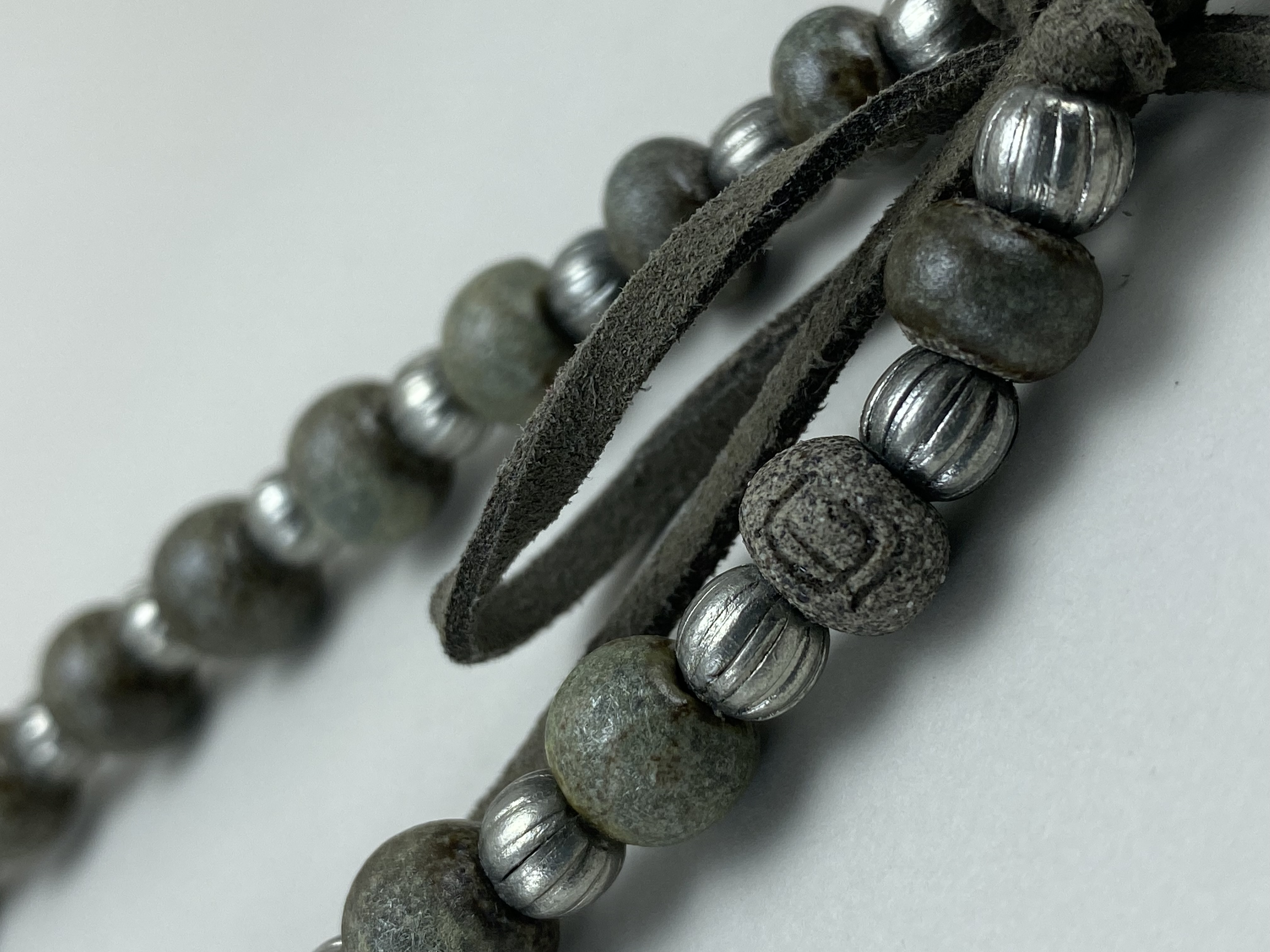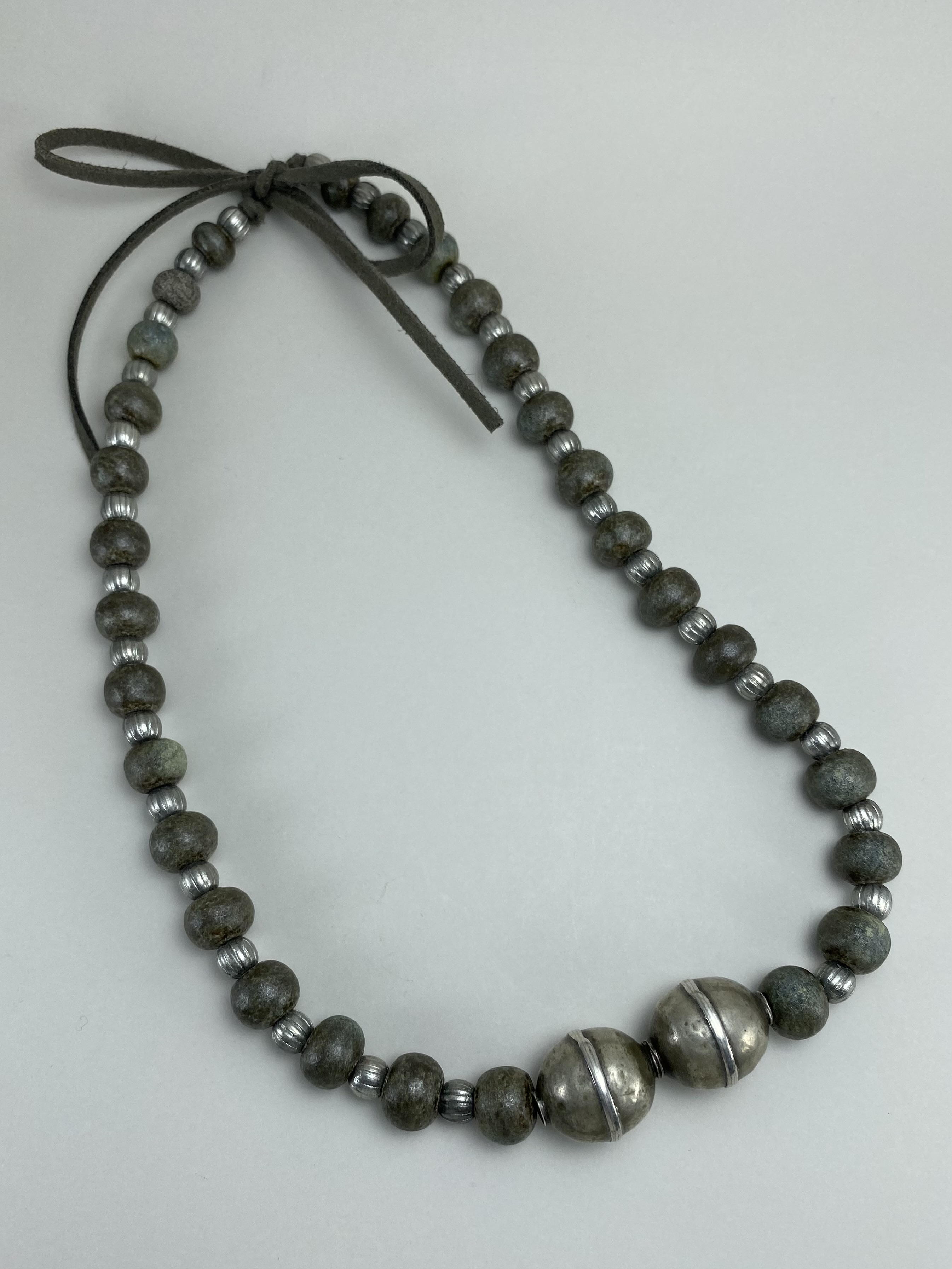 Materials: Sibelco clay, Welte glazes, faux suede cord, old metal beads.