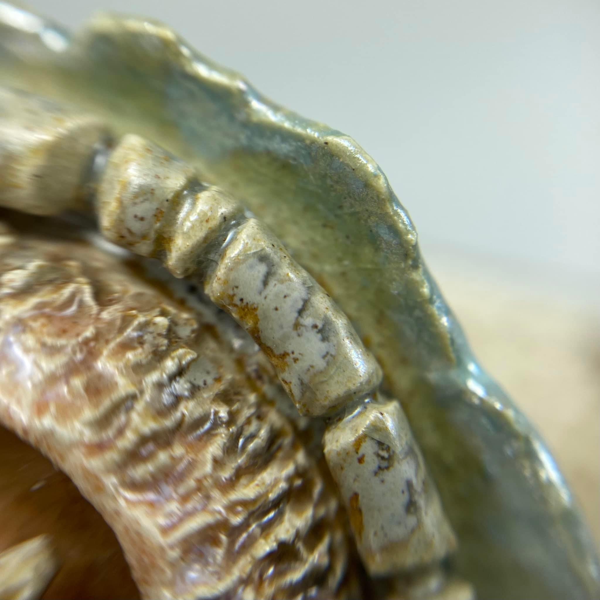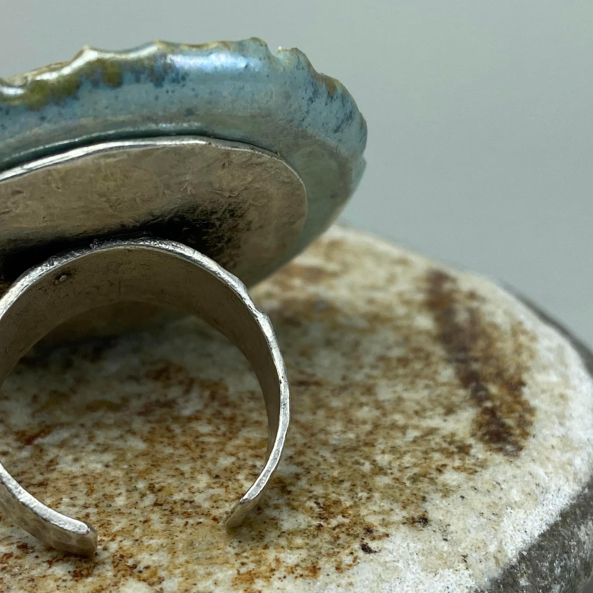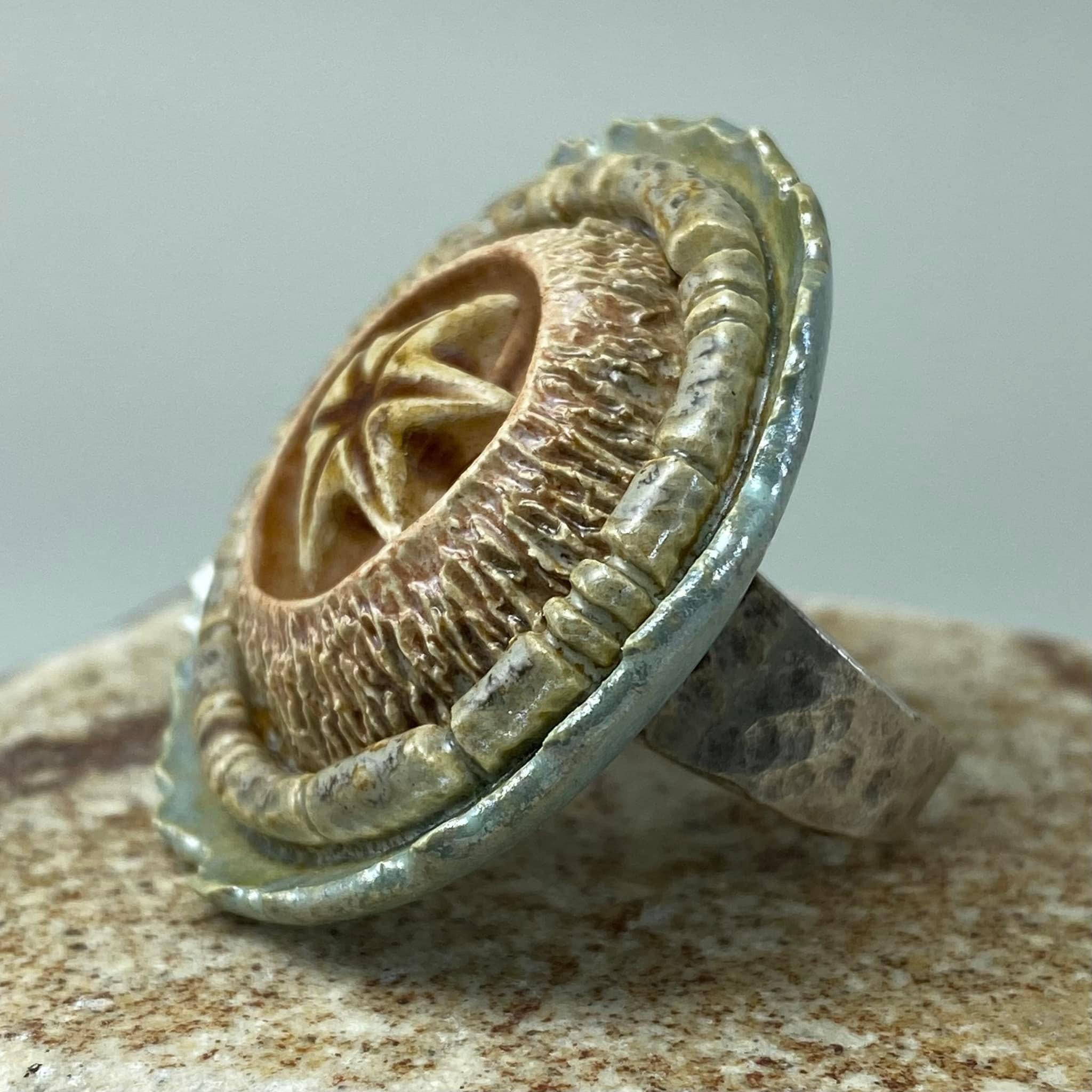 Large, heavy ceramic ring shaped like a eucalyptus seed pod. One-of-a-kind, no replicas will be made.