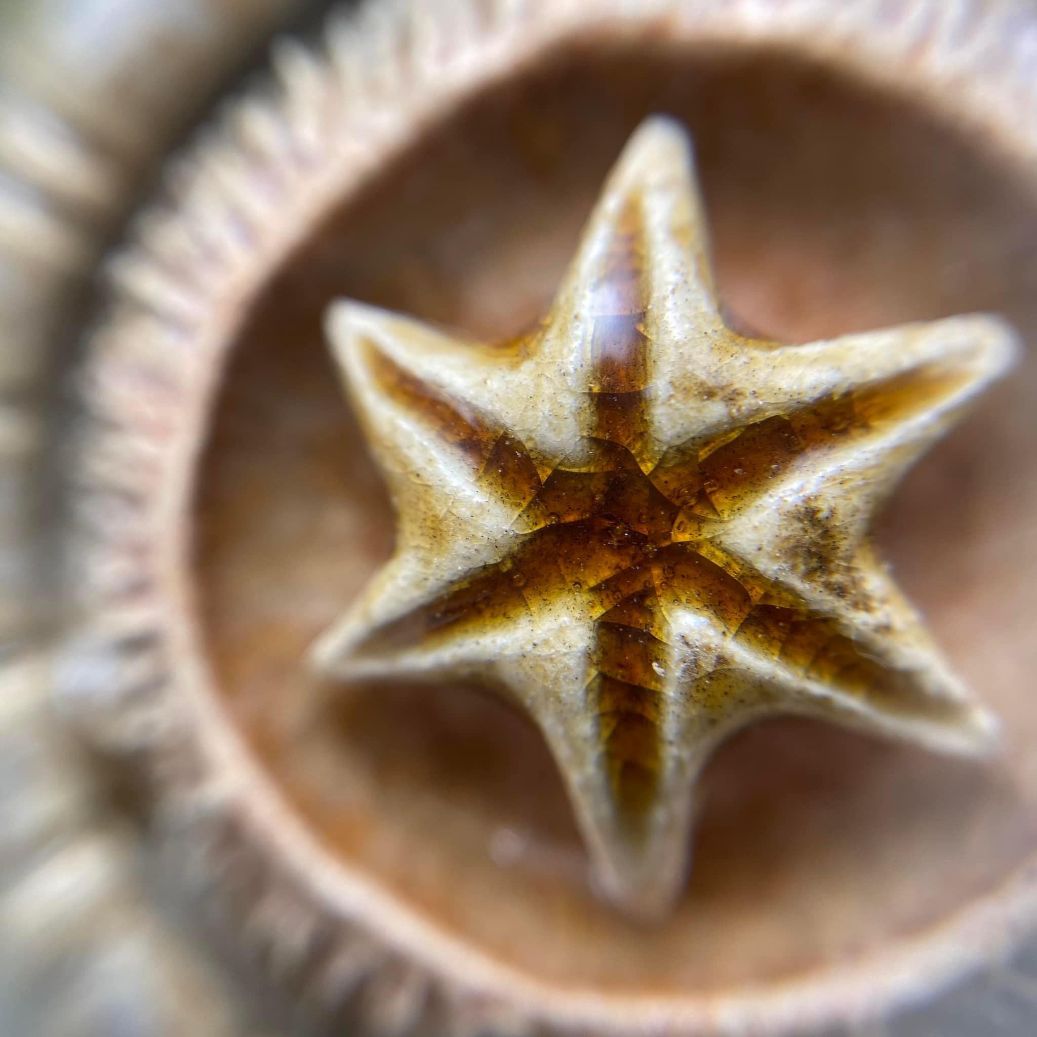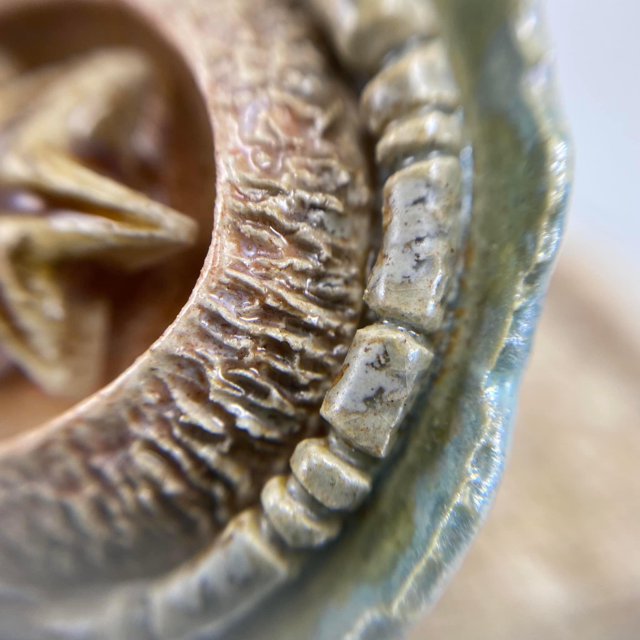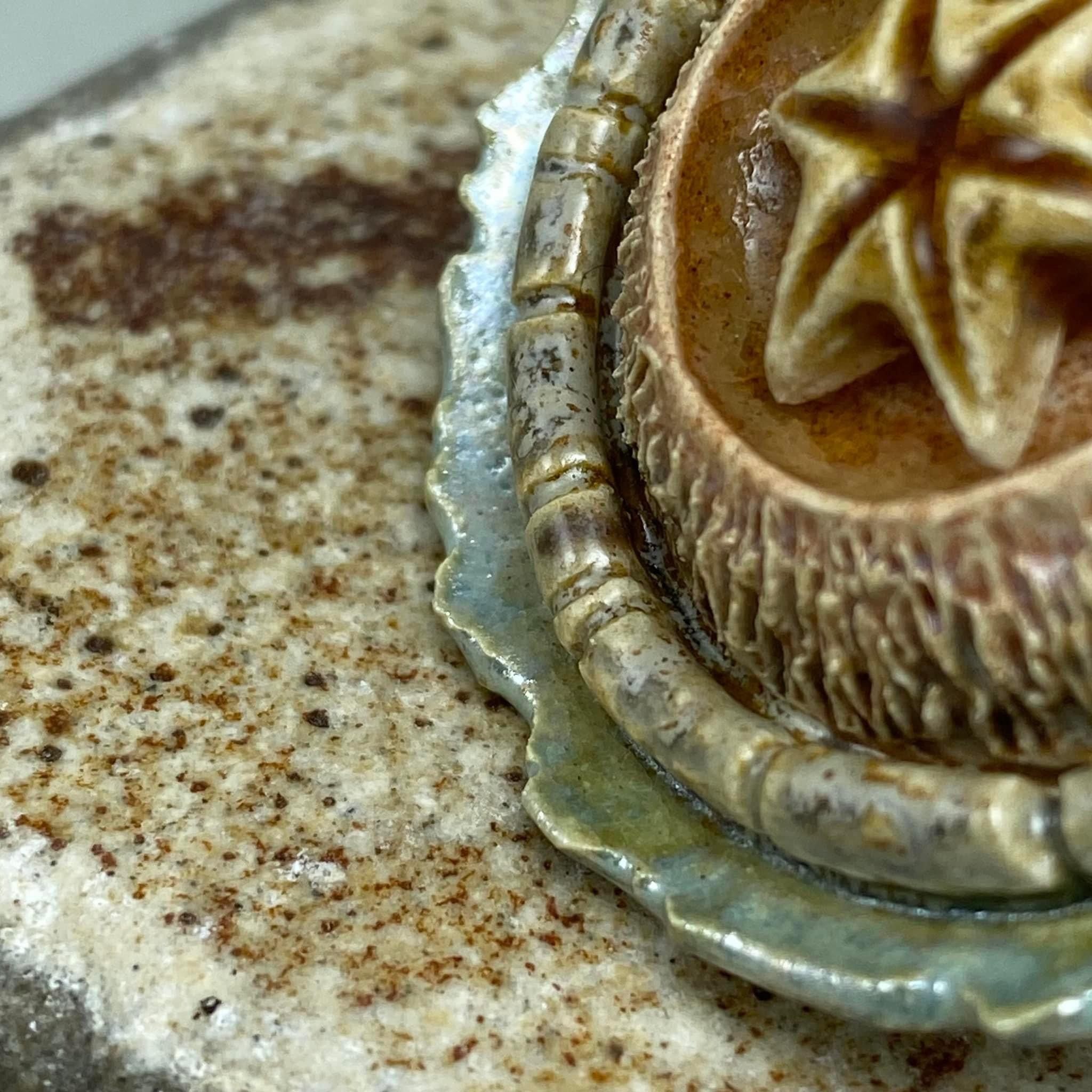 Large, heavy ceramic ring shaped like a eucalyptus seed pod. One-of-a-kind, no replicas will be made.